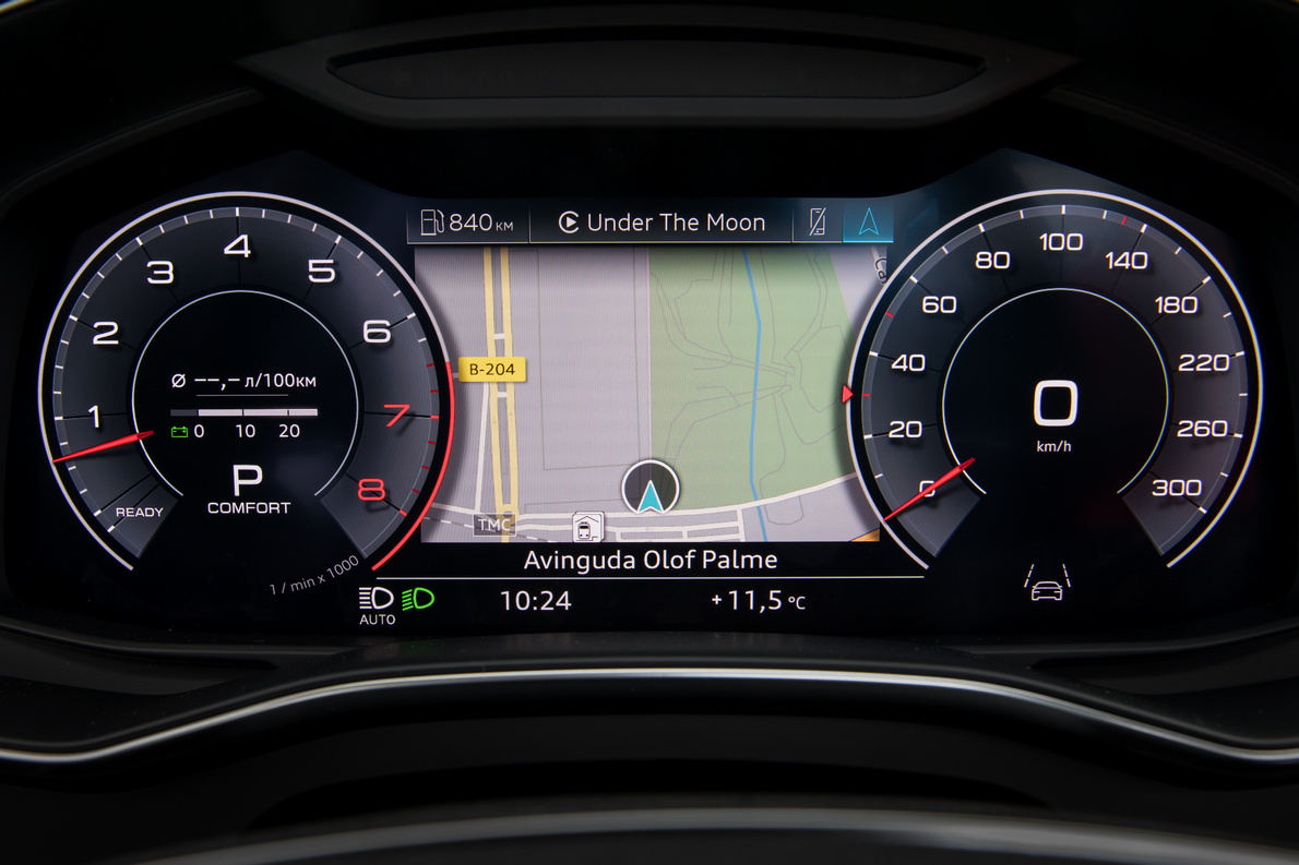 Виртуальное окружение водителя, где почти нет обычных кнопок, очень красиво и наглядно, но, увы, не всегда удобно в использовании — приходится отвлекаться от дороги, чтобы попасть пальцем в нужную часть экрана. Понятно, что когда за дорогой будет следить автоматика, это станет не столь актуально, но пока мы скучаем по удобной шайбе системы MMI.