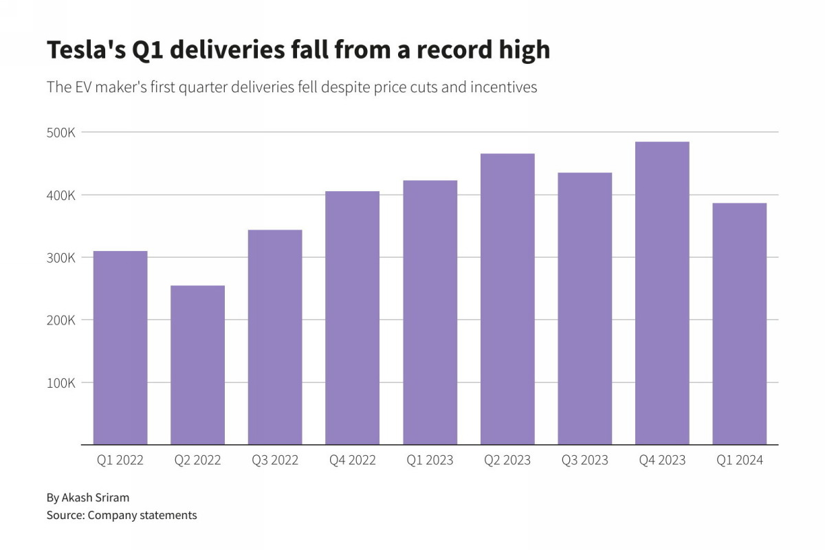Компания Tesla Inc отчиталась о снижении объемов поставок электромобилей марки по итогам первого квартала 2024 года.