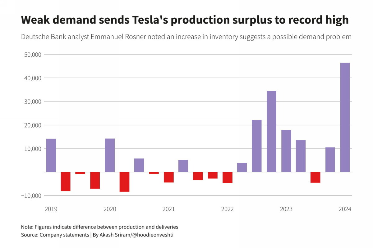Сам производитель заявляет, что снижение продаж в первом квартале текущего года частично объясняется подготовкой завода во Фримонте (Калифорния) к производству обновленной версии Model 3, а также приостановкой работы предприятия в Берлине из-за конфликта в Красном море. Однако аналитики отмечают, что Tesla выпустила в первом квартале на 46 тыс. больше машин, чем продала, что может говорить о проблемах не только с производством, но и со спросом.