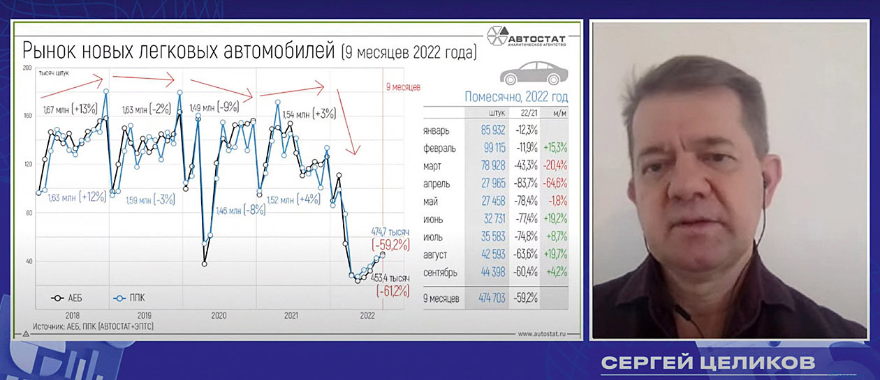 Как рассказал исполнительный директор агентства Сергей Удалов, продажи на авторынке РФ по итогам 9 месяцев 2022 года упали во всех сегментах и по всем категориям транспортных средств. Наиболее драматическим (–59%) было падение в легковом сегменте, до 474,7 тыс. единиц; на 46% (до 55,3 тыс. ед.) сократились продажи легких коммерческих машин (LCV); рынок грузовиков сократился за 9 месяцев на 19% (до 58,7 тыс. ед.), тогда как в сегменте автобусов продажи снизились минимально: на 1% (до 8,9 тыс. шт.). На автомобильном рынке в целом с января по сентябрь реализовано в общей сложности 597,5 тыс. транспортных средств всех типов, что на 56% меньше, чем за аналогичный период прошлого года.