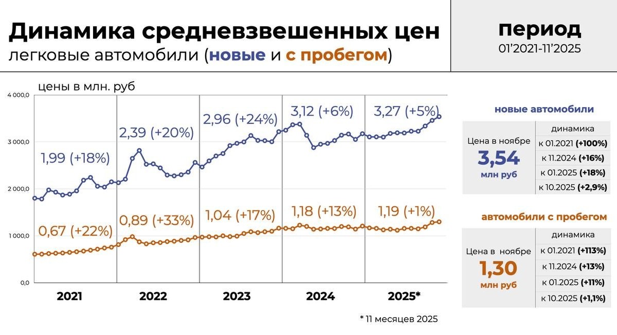 Средневзвешенная цена нового легкового автомобиля в России составила в ноябре 3,54 млн рублей, сообщает в своем Телеграм-канале директор «Автостата» Сергей Целиков.