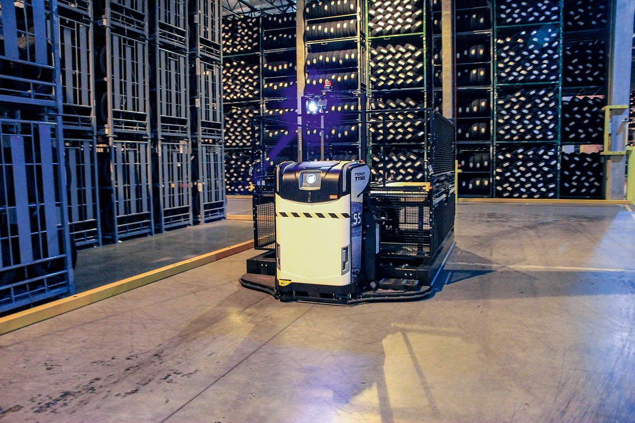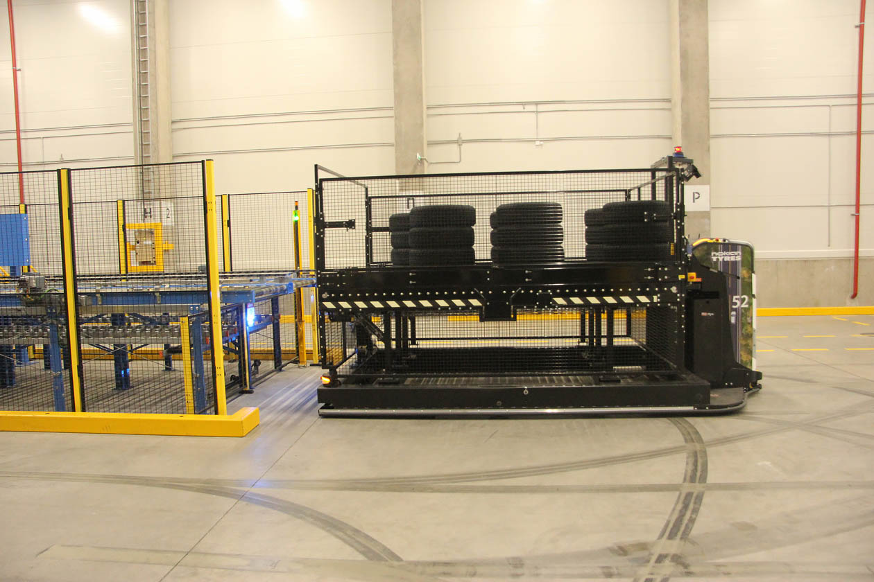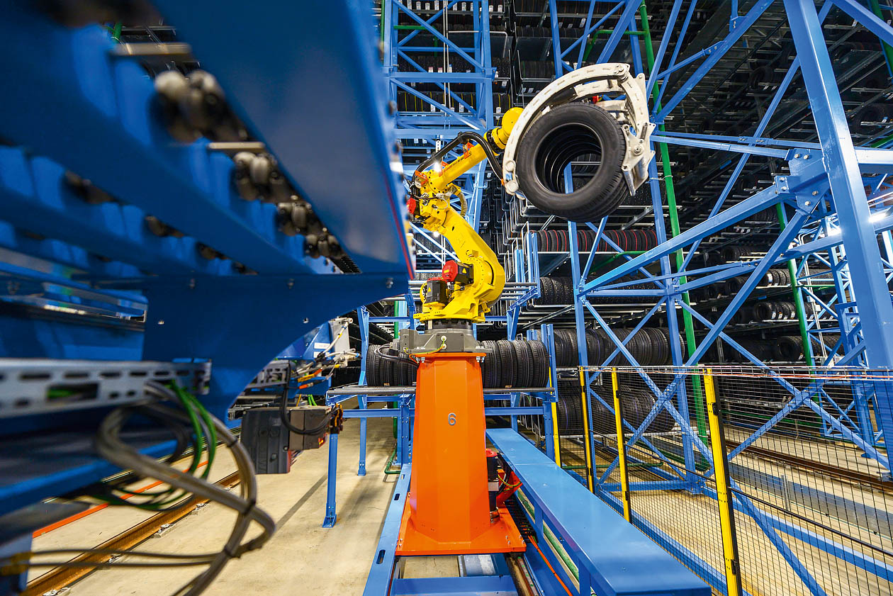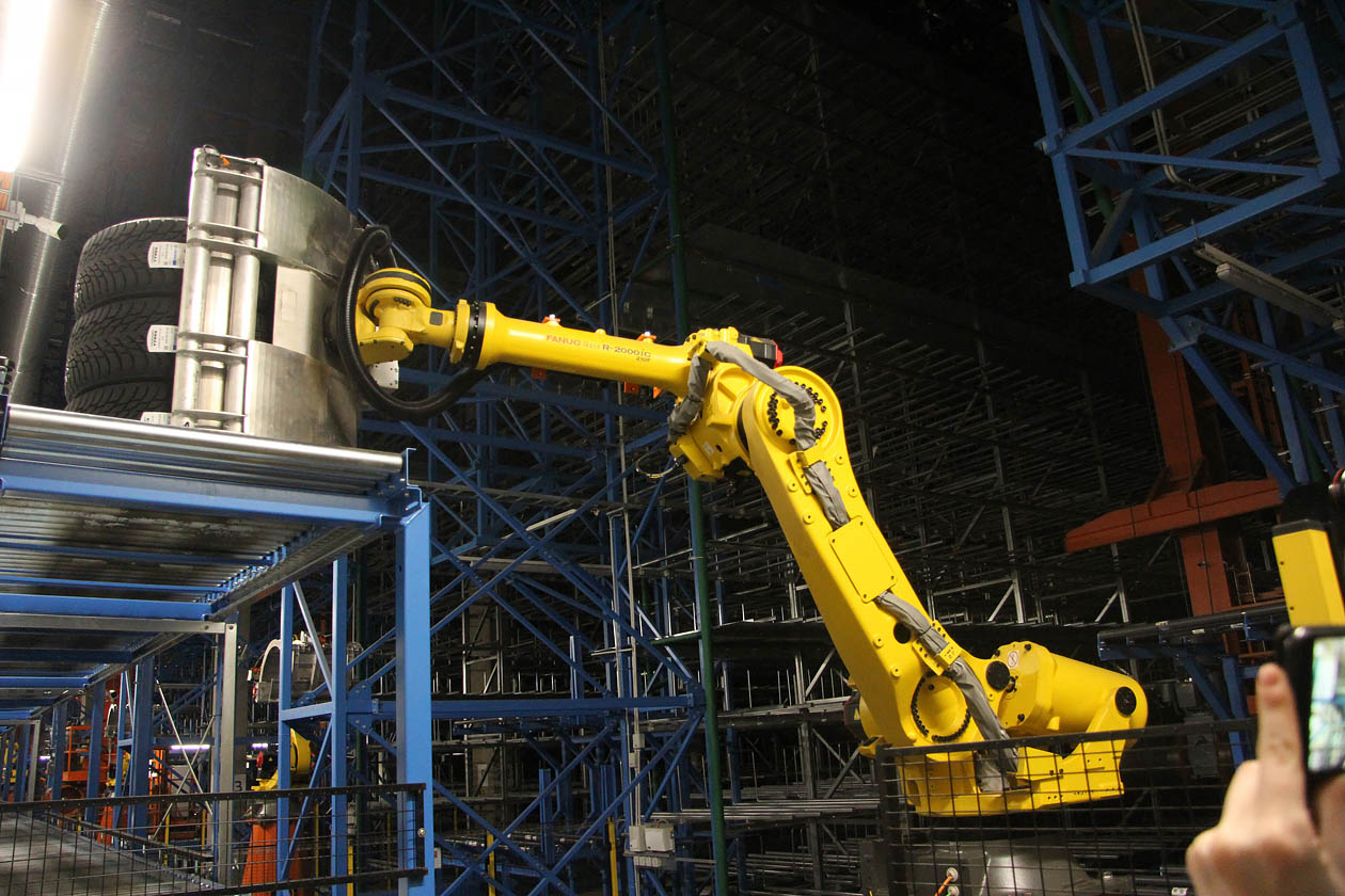 Итак, отныне процесс загрузки склада устроен следующим образом. Произведенные шины безо всякого промежуточного хранения с помощью специальных идентификаторов поступают на транспортные ленты, по которым распределяются в том или ином направлении в зависимости от модели и размера. По нужным местам склада их развозят роботы-погрузчики, а уже непосредственно по полкам раскладывают роботы-манипуляторы, которые могут взаимодействовать с огромными автоматическими кранами с поднимающейся платформой. И все это происходит без участия людей, что вживую выглядит действительно потрясающе.
