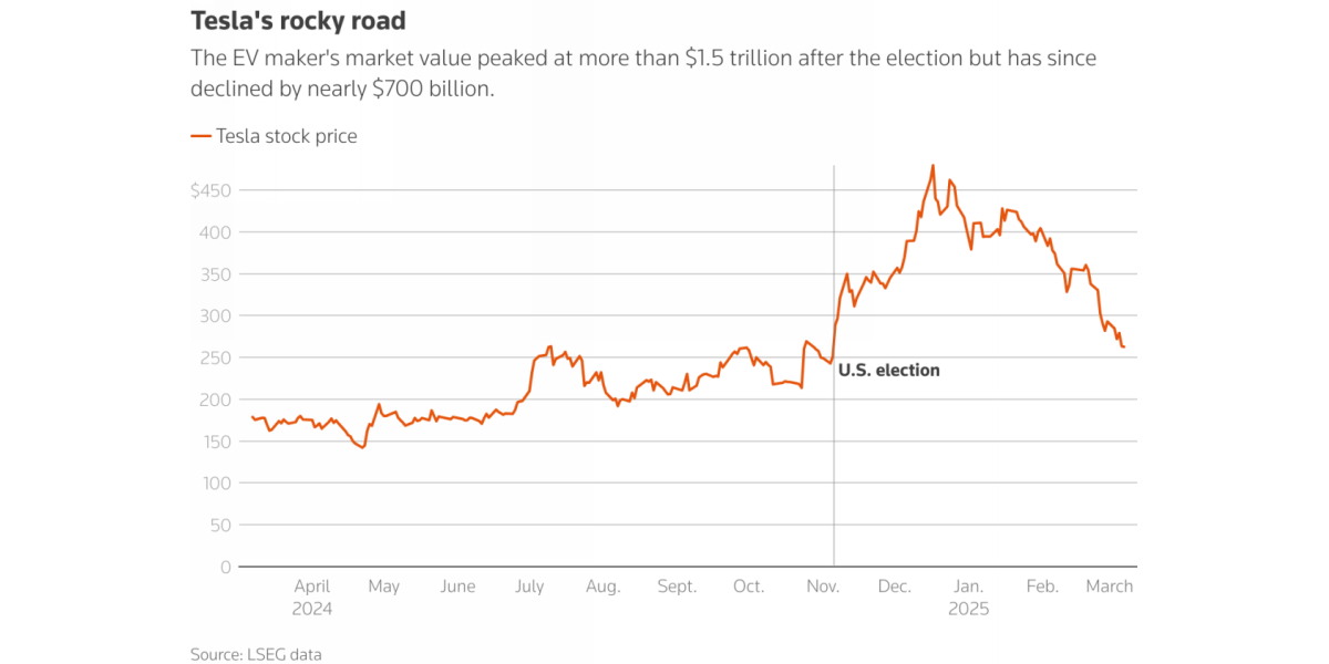 Падение стоимости акций компании вызвано падением продаж и прибыли автомобилей, протестами клиентов против политической активности Маска (включая инициированные им на посту советника президента массовые увольнения госслужащих США), а также опасениями инвесторов, что политика отвлекает главу «Теслы» от управления компанией.