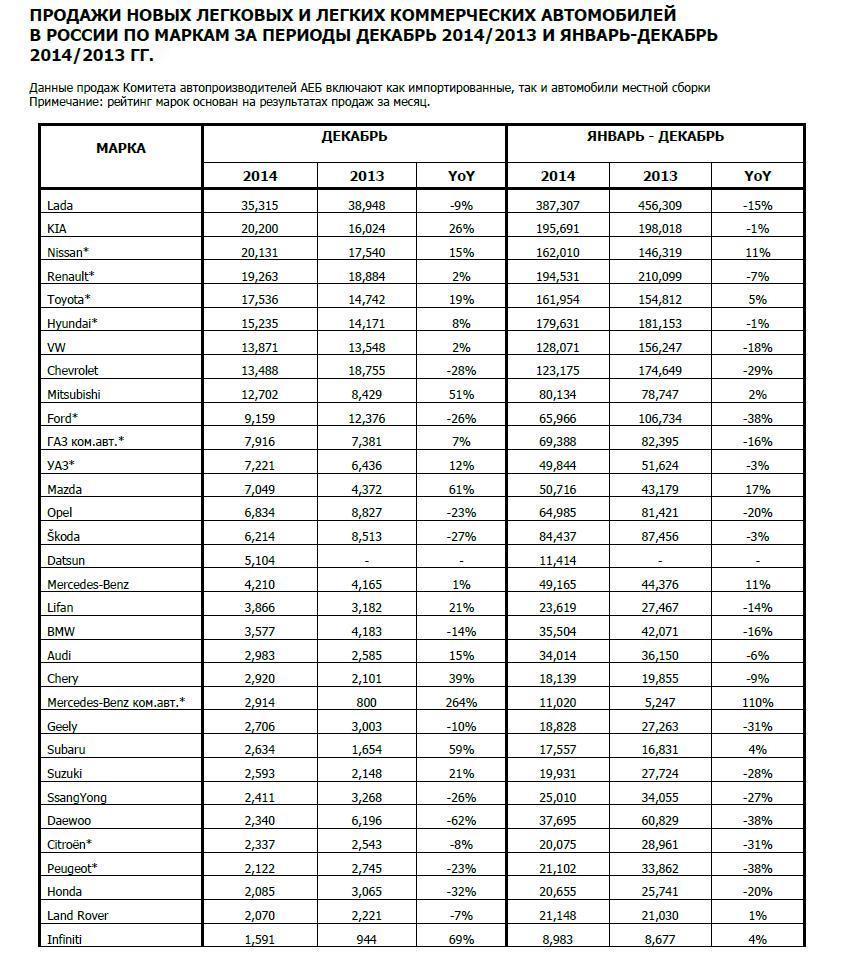 В общем и целом в 2014 году россияне купили 2 491 404 легковых и легких коммерческих автомобилей. Как ни странно это звучит, большой вклад в улучшение статистики продаж внес обвал курса рубля в декабре прошлого года, когда люди в панике бросились избавляться от денежных сбережений, выметая из шоу-румов все без исключения автомобили.