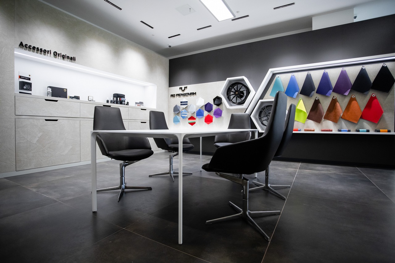 В специальной интерактивной части салона клиенты смогут узнать об уникальных характеристиках автомобилей Lamborghini и даже услышать характерные звуки их двигателей. Отдельно разместится студия Ad Personam, где клиентам будут предложены разнообразные варианты цветовых решений, материалов, отделки и дополнительных аксессуаров для персонализации своего Lamborghini. Индивидуальный подбор доступен для представленных в шоуруме предметов одежды и аксессуаров из коллекции Collezione Automobili Lamborghini.