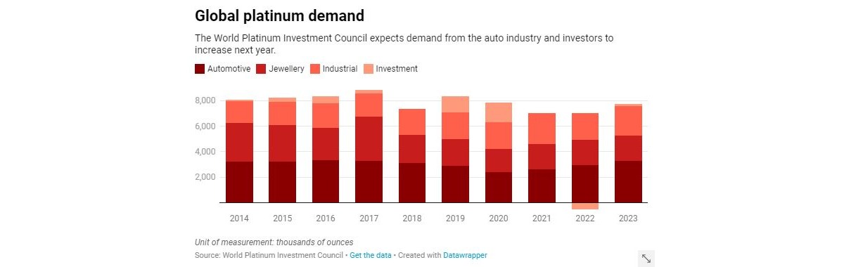 Всемирный совет по инвестициям в платину (WPIC) заявил, что ожидает возникновения дефицита данного металла на мировом рынке в 2023 году после существенного излишка в 2022-м.