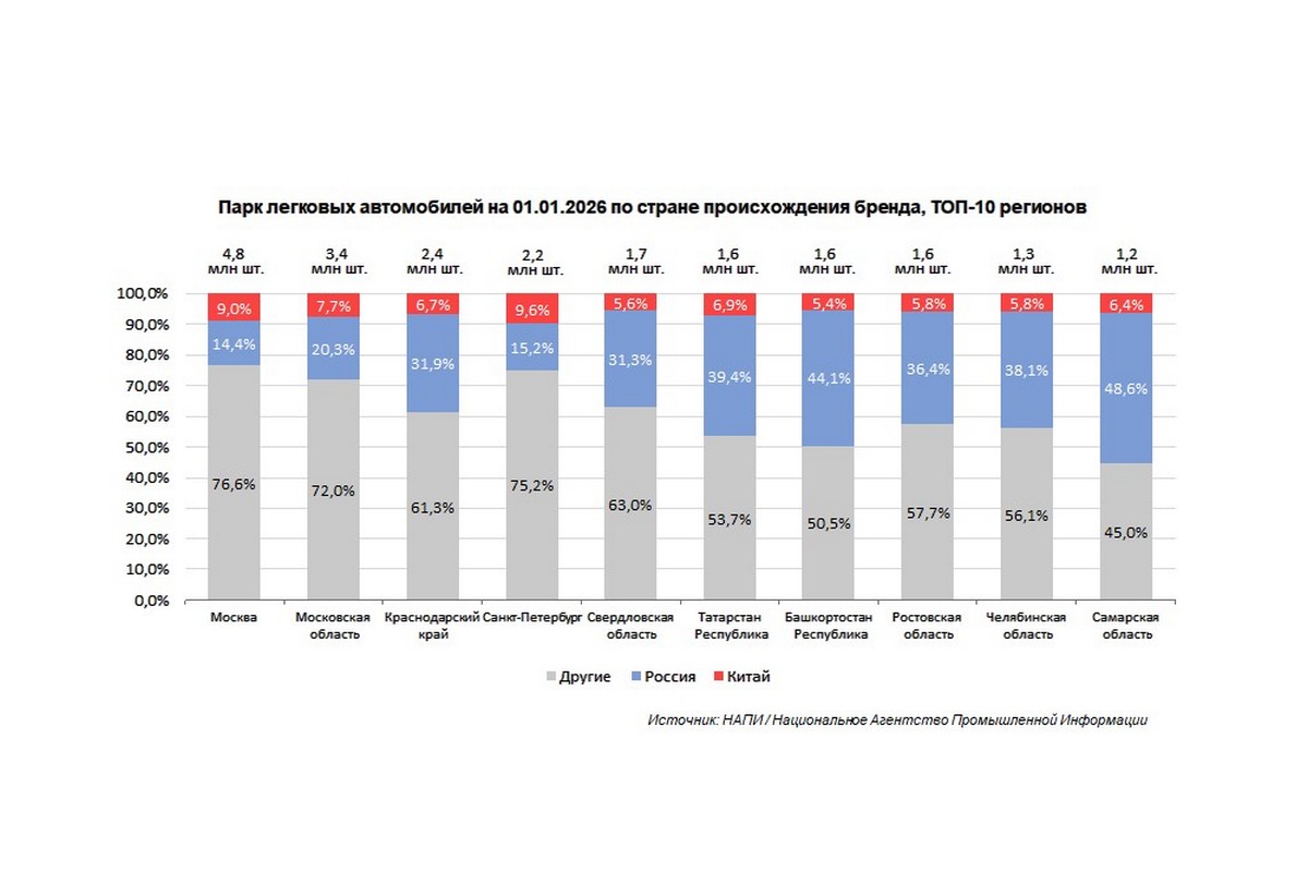 На топ-10 регионов приходится 41,1% парка легковых машин. Доля отечественных «легковушек» составляет 27,6%, а китайских – 7,4%.