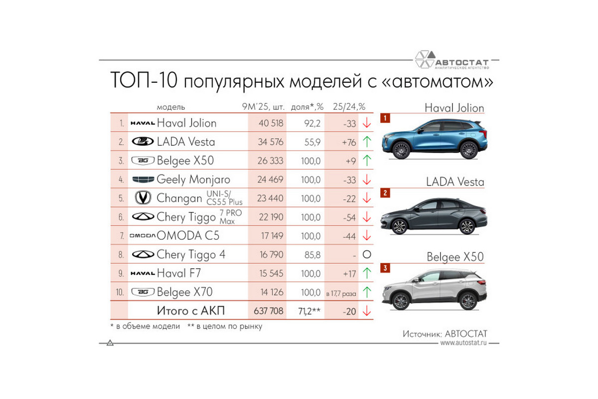 За ним следуют Lada Vesta с «автоматом» (34 576 шт.; +76%), Belgee X50 (26 333 шт.; +9%), Geely Monjaro (24 469 шт.; -33%) и Changan UNI-S/CS55 Plus (23 440 шт.; -22%).