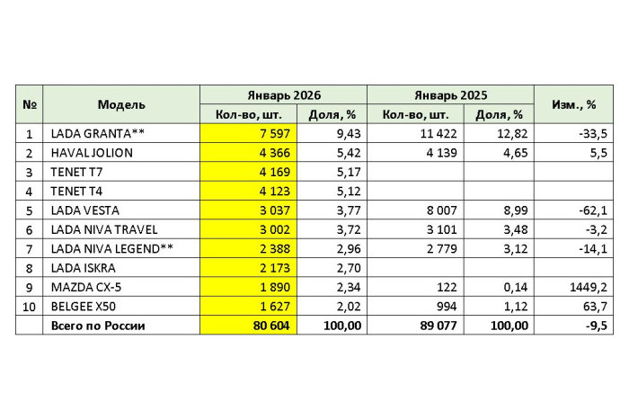 В рейтинге среди моделей обращает на себя внимание вылет из первой тройки Lada Vesta – популярную прежде вазовскую модель вытеснили оттуда «китайцы». Лидирует на отечественном рынке по-прежнему Lada Granta (в январе россияне приобрели 7597 «Грант» – на 33,5% меньше, чем в январе 2025-го), далее следуют Tenet T7 (1469 ед.), Tenet T4 (4123 ед.), Vesta же лишь на пятом месте с результатом 3037 ед. (–62,1%).