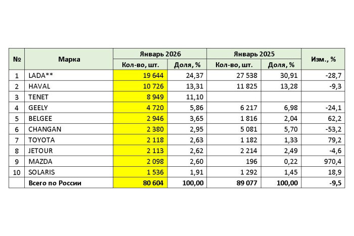 Лидер авторынка РФ среди брендов остался неизменным – это по-прежнему отечественная марка Lada: россияне приобрели в январе без малого 20 тыс. автомобилей бренда (19 644 шт., что на 28,7% меньше, чем в январе 2025 г.).