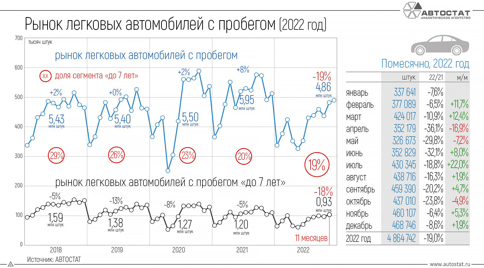 Не сумев найти новую машину у дилера, покупатели бросились на «вторичку», так что ценники подскочили и там. По данным «Автостата», средневзвешенная цена автомобиля с пробегом в 2022 году достигла отметки 0,89 млн рублей (+32%), а продажи упали до 4 864 746 ед. (–19,0%).