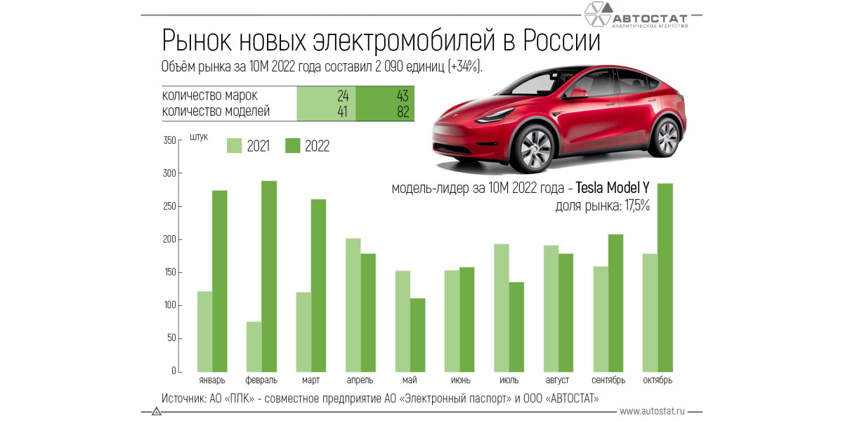 По информации «ППК», в январе-октябре текущего года россияне приобрели в общей сложности 2090 новых электромобилей – на 34% больше, чем за январь-октябрь 2021 г.