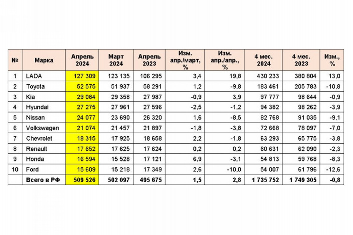 В годовом сравнении положительная динамика отмечается только у трёх брендов: Renault (+0,2%), Kia (+3,9%) и Lada (+19,8%). Сильнее всех в «минусе» оказался Ford (-10%).