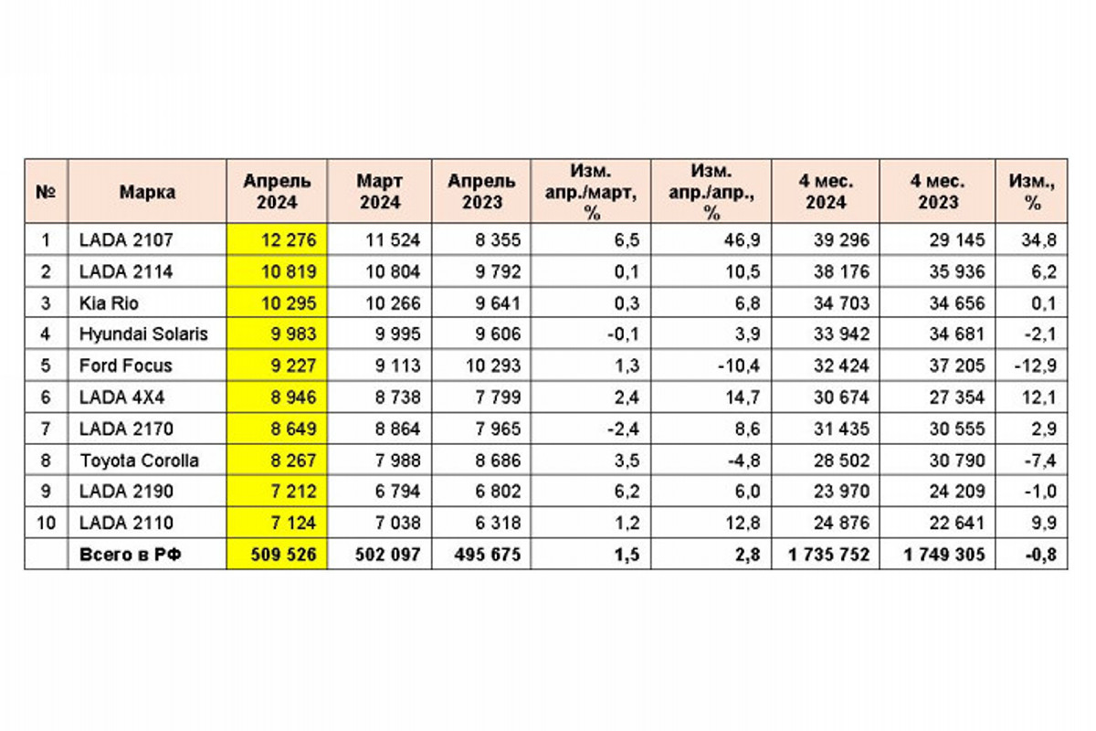 В модельном рейтинге третий месяц подряд лидирует Lada 2107. В апреле в РФ было продано 12 276 таких автомобилей. Далее расположились – Lada 2114 «Самара-2» (10 819 шт.), Kia Rio (10 295 шт.), Hyundai Solaris (9983 шт.), Ford Focus (9227 шт.), Lada 4x4 (8946 шт.), Lada 2170 (8649 шт.), Toyota Corolla (8267 шт.), Lada 2190 (7212 шт.) и Lada 2110 (7124 шт.).