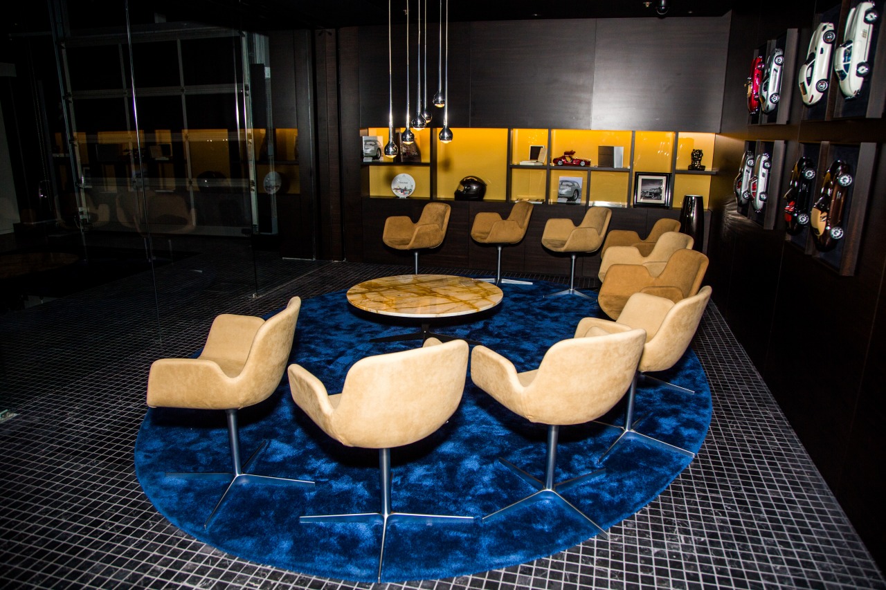 Вторая задумка, резко отличающая интерьер автоцентра от любого другого, — здесь нет привычных столов, компьютеров, принтеров, бумажек и прочей офисной ветоши, абсолютно все это упрятано в потайные ниши и двери прямо в стенах. Нажатие на них — и перед тобой открывается уютное купе, где можно обсудить с клиентом все этапы сделки. А если нужно, можно и целую переговорную занять.