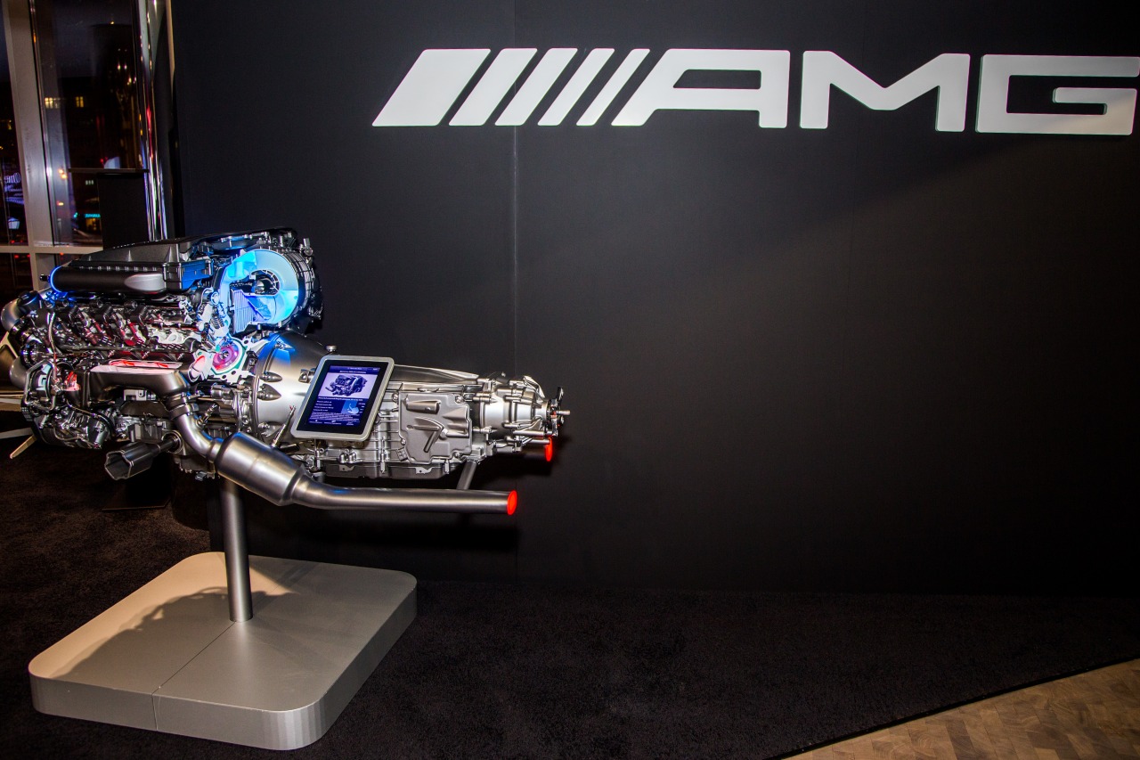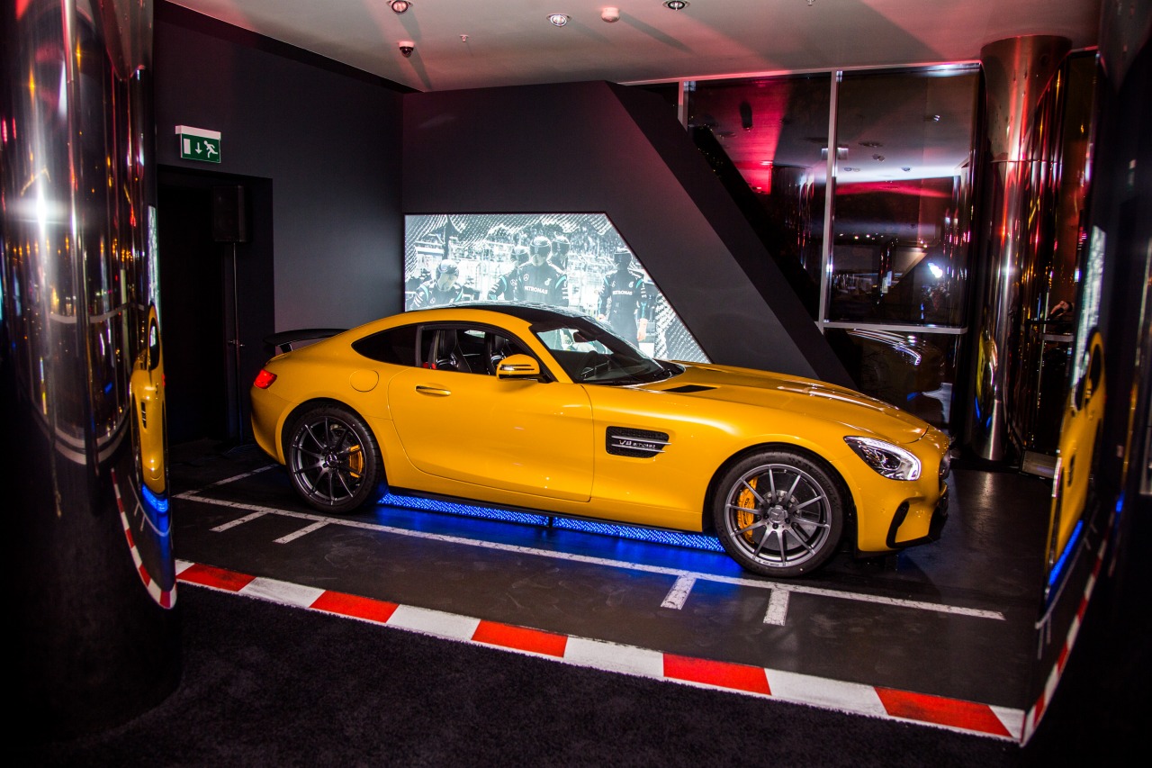 На противоположной стороне салона расположена зона другого пространства — AMG. Тут атмосфера едва ли ни настоящего «формульного» пит-лейна: гоночные технологии на картинах и наяву, высокофорсированные и собранные вручную моторы и, конечно, самые спортивные версии Mercedes-Benz. Только что Виталия Петрова не хватает. А, простите: он тоже здесь!