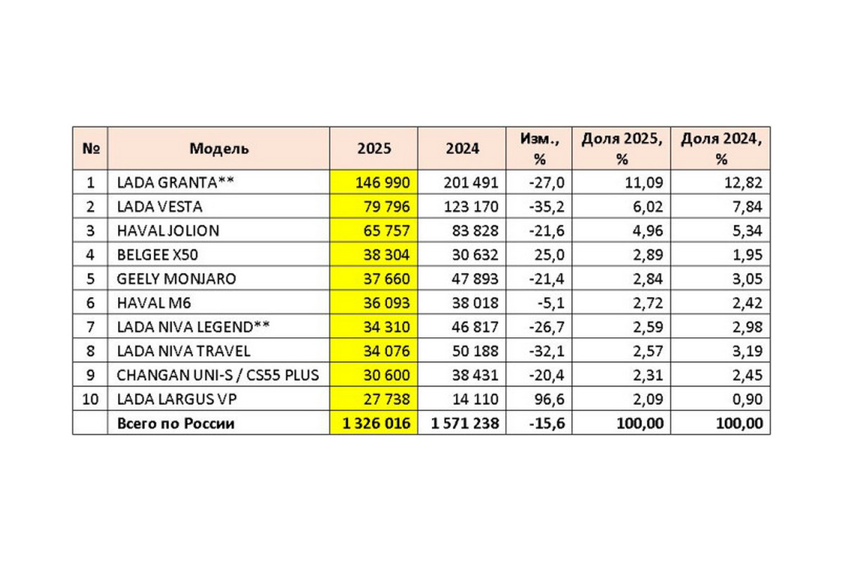 В модельном рейтинге лидируют Lada Granta (146 990 шт.), Lada Vesta (79 796 шт.), Haval Jolion (65 757 шт.), Belgee X50 (38 304 шт.), Geely Monjaro (37 660 шт.), Haval M6 (36 093 шт.), Lada Niva Legend (34 310 шт.), Lada Niva Travel (34 076 шт.), Changan UNI-S/CS55 Plus (30 600 шт.) и Lada Largus VP (27 738 шт.).