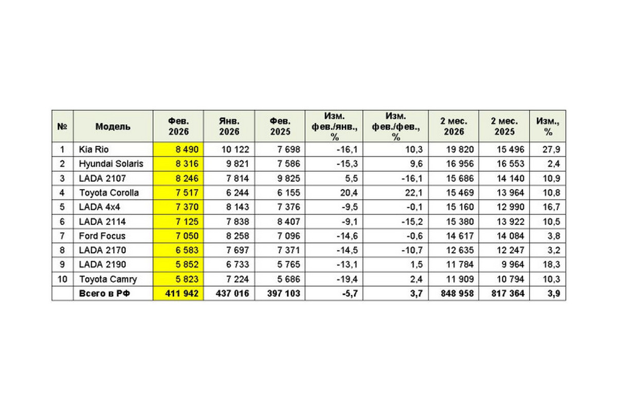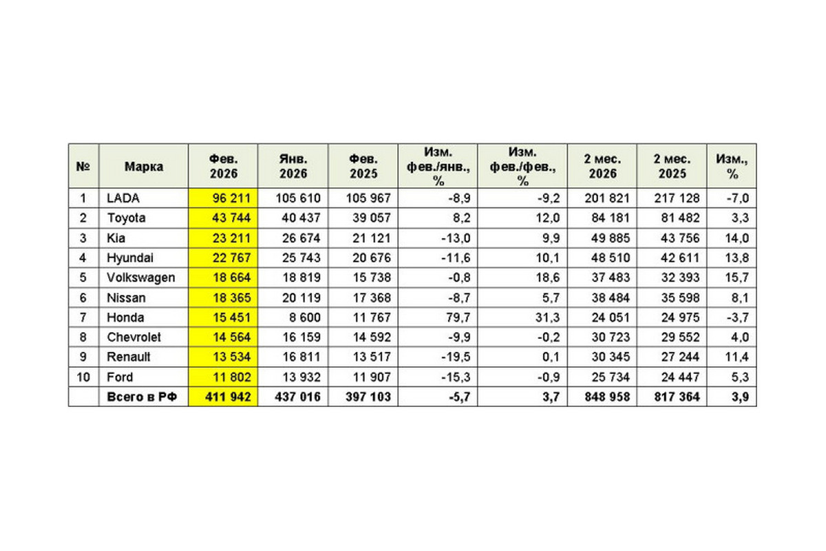 Такой результат на 5,7% меньше, чем в предыдущем месяце и на 3,7% больше, чем в феврале 2025 года, сообщает «Автостат».