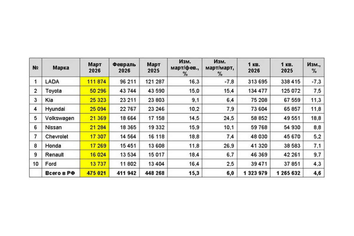 В марочном рейтинге лидируют Lada (111 874 шт.), Toyota (50 296 шт.), Kia (25 323 шт.), Hyundai (25 094 шт.) и Volkswagen (21 369 шт.). В топ-10 также попали Nissan (21 284 шт.), Chevrolet (17 307 шт.), Honda (17 269 шт.), Renault (16 024 шт.) и Ford (13 737 шт.).