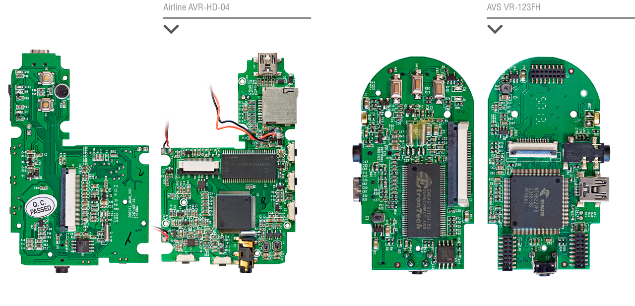 Наилучшее качество обнаружилось у Intego VX-275HD — печатная плата и полностью автоматическая пайка. Неплохо сделан и AVS VR-123FH. Видимых следов ручной пайки не обнаружилось, и само качество пайки вполне приличное. Для компактности схема разнесена на две платы, соединение которых выполнено на крепких разъемах. Ручная пайка нашлась у Airline AVR-HD-04 и «Видеосвидетеля 2403 FHD», но у Airline она несколько аккуратнее и укреплена термоклеем.