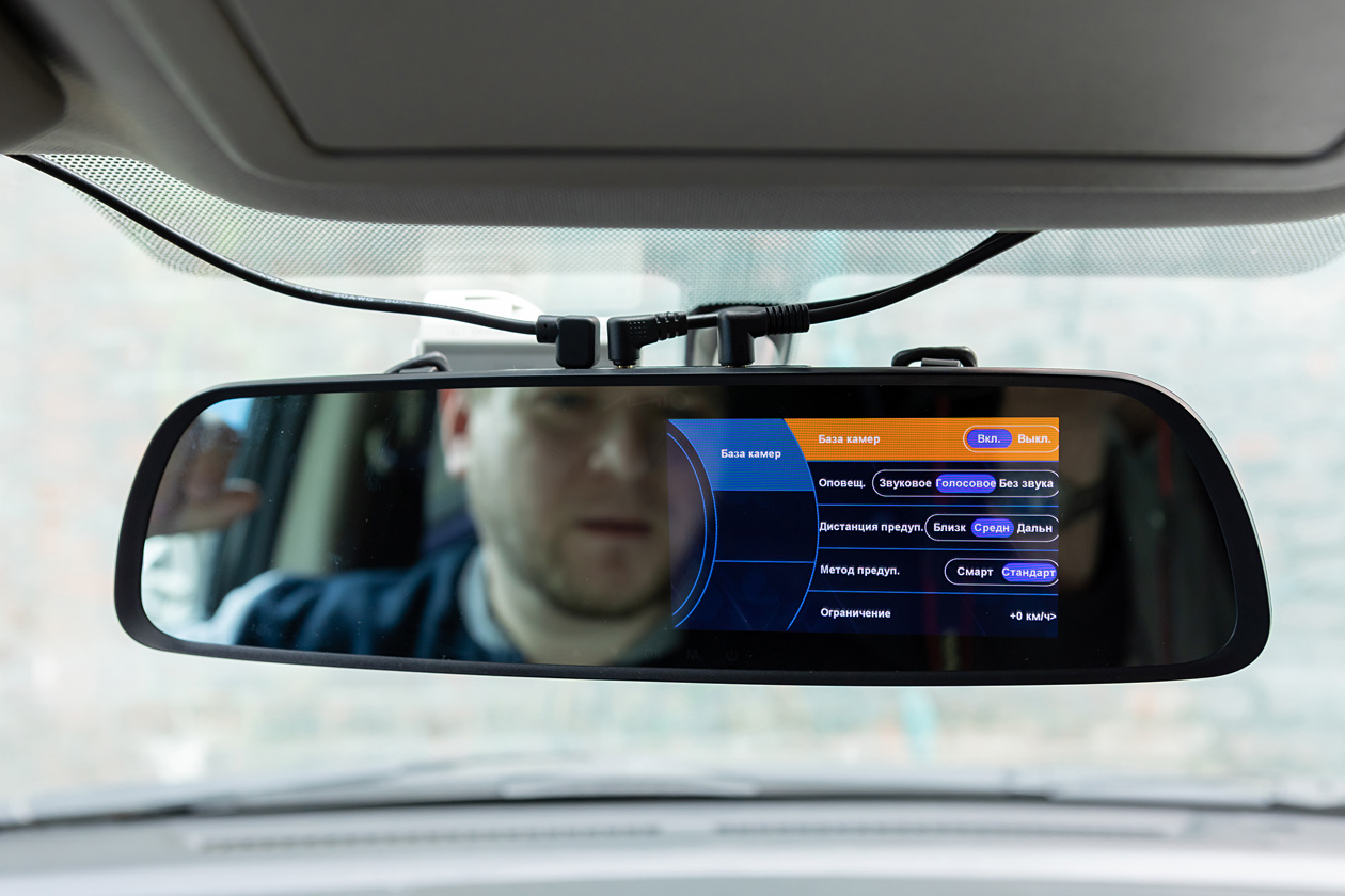В комплект видеорегистратора входят: GPS‑приемник, чтобы контролировать приближение к камерам контроля нарушений, камера заднего вида, длинный кабель питания для скрытой установки «зеркала» и две пары резиновых держателей для крепления регистратора к «родному» зеркалу автомобиля.