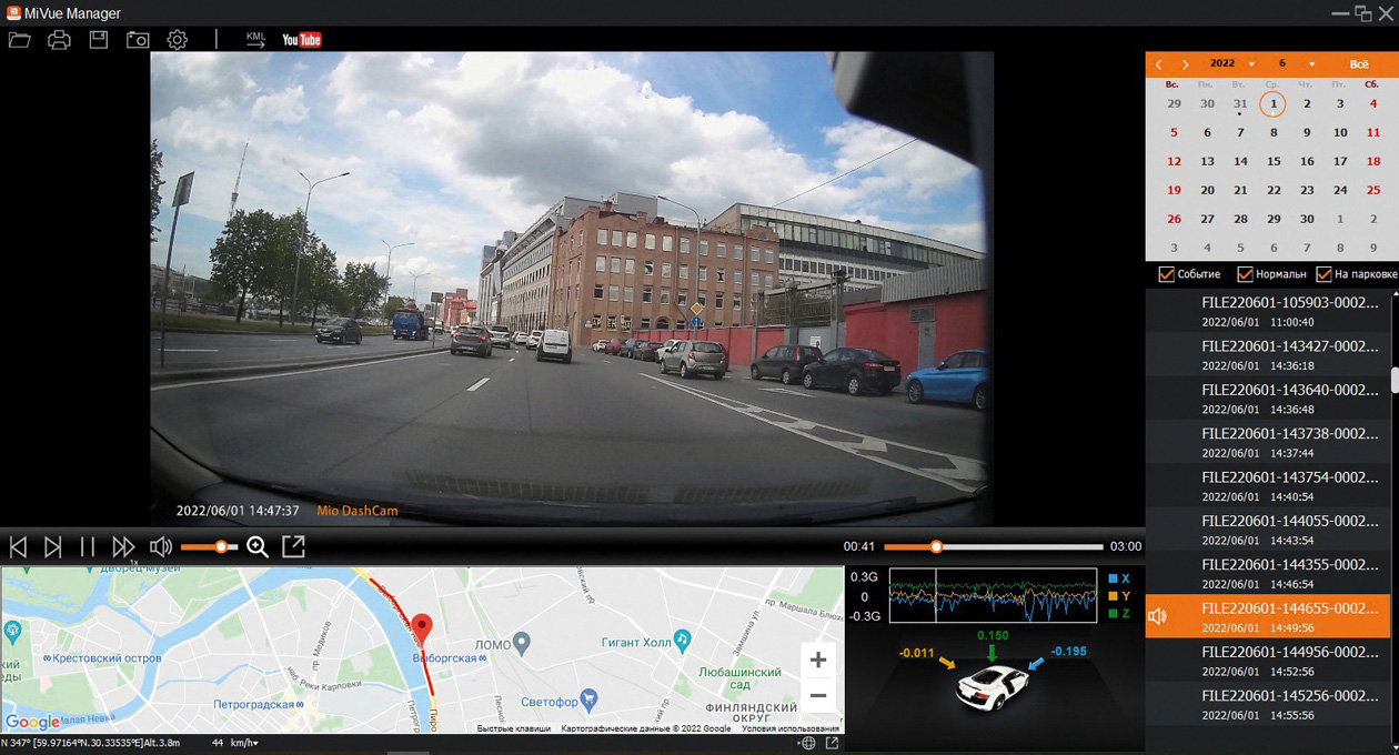На официальном сайте Mio можно также скачать специальную программу MiVue Manager, который позволяет просматривать видео с фронтальной камеры и с камеры заднего вида, причем с подробным трекингом, где и когда был снят каждый видеоролик вплоть до секунды и до метра. Это может стать очень двойственным способом доказать свою правоту в суде, если возникнет какая-либо спорная ситуация с представителями дорожной полиции.