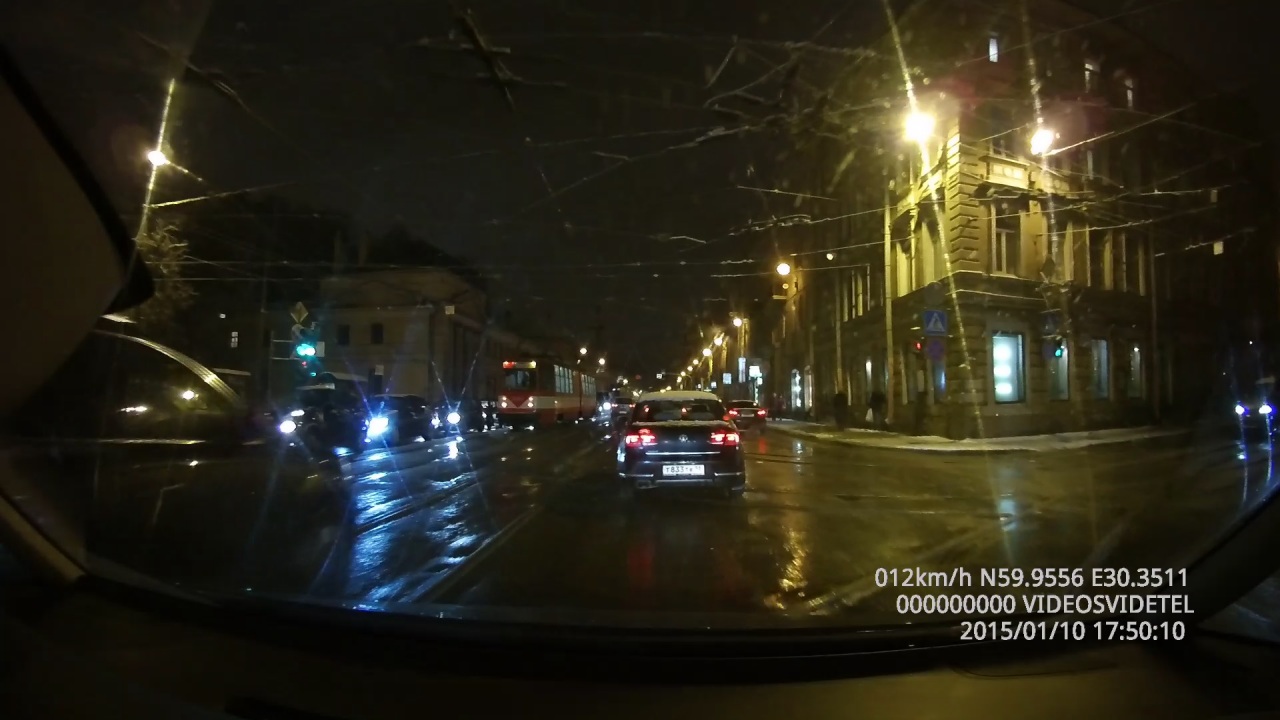 Вполне достойно проявил себя 60-кадровый режим при ночной съемке, особенно если учитывать что условия в которые попал регистратор оказались для съемки одними из самых худших — мокрая оттепель, брызги от всех автомобилей в потоке, мелкая сырая взвесь в воздухе. Однако регистратор вполне успешно справлялся с бликами от встречных фар, нигде не допустив «забеливания» картинки.