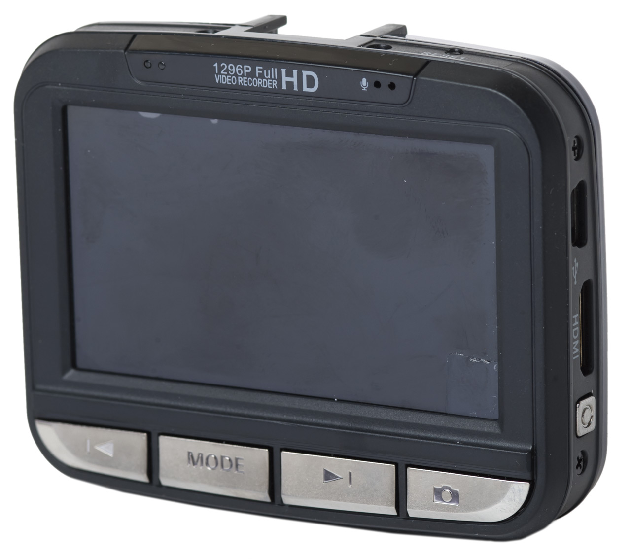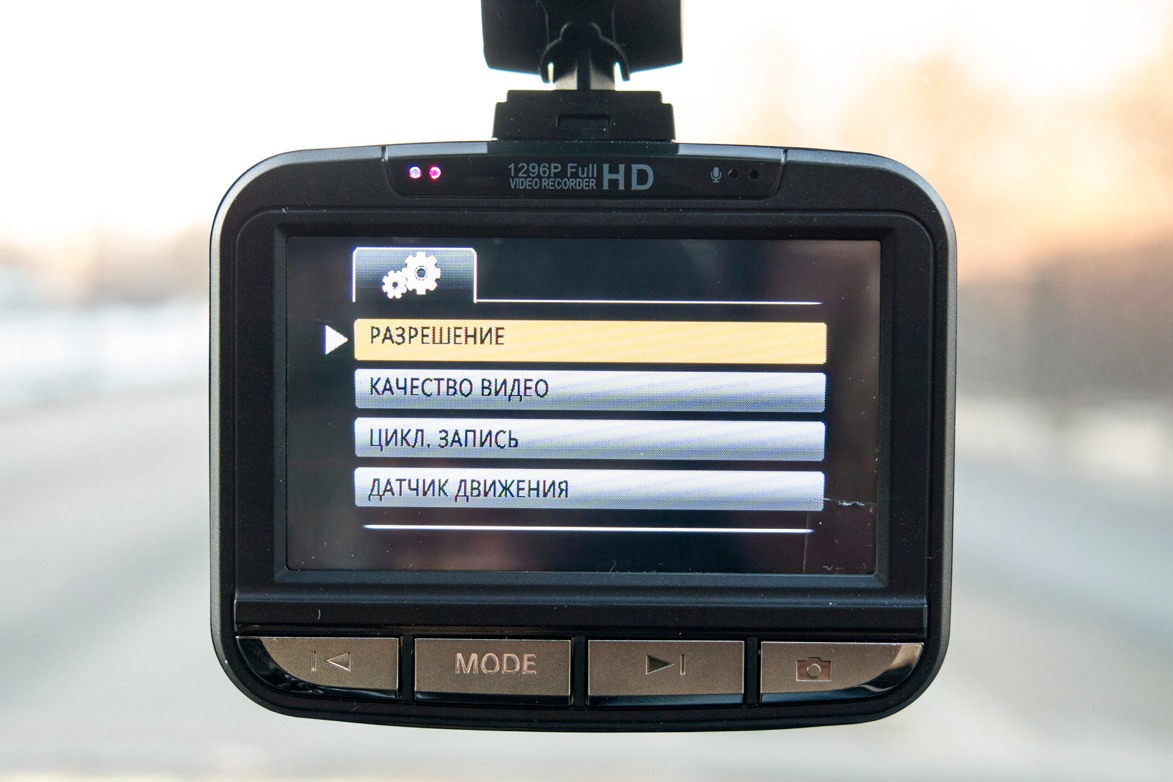 Всю лицевую часть корпуса (обращенную в салон) занял большой квадратный дисплей (2.7 дюйма) и ряд кнопок управления под ним. Компоновка очень удобная и работать с менб здесь не составляет труда даже когда регистратор стоит на кронштенйне. Единственный момент — расположенную сбоку кнопку REC/OK и кнопку MODE на лицевой стороне стоило бы поменять местами, переназначив их функции.