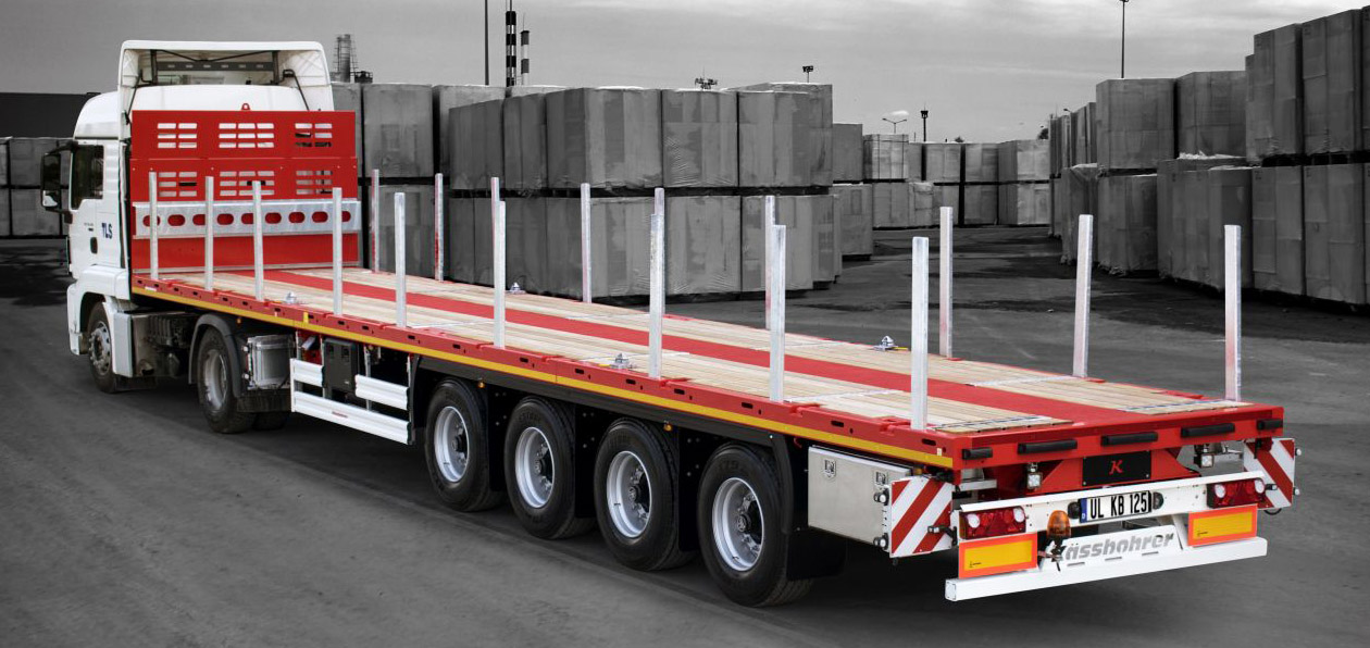 Четырехосный нераздвижной большегрузный полуприцеп-платформа K.SPS H4 позволяет осуществлять надежную и безопасную транспортировку тяжелых, габаритных и неустойчивых грузов благодаря прочной и ровной платформе.