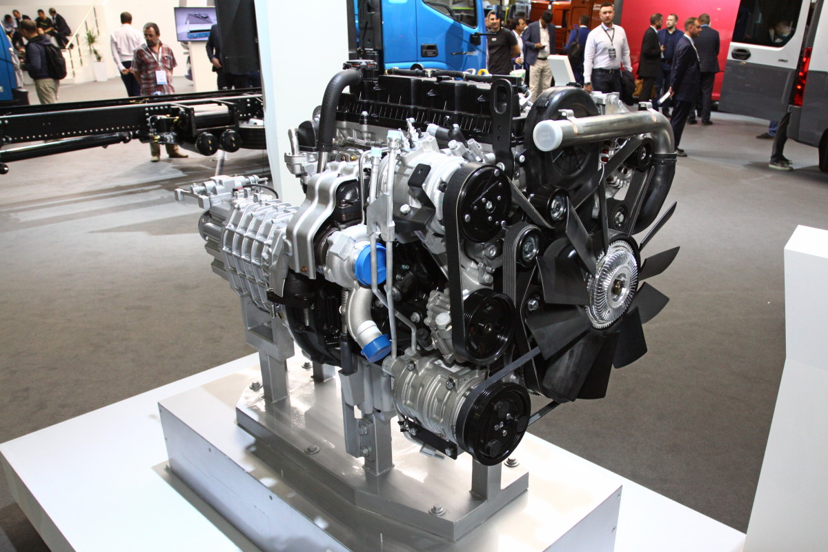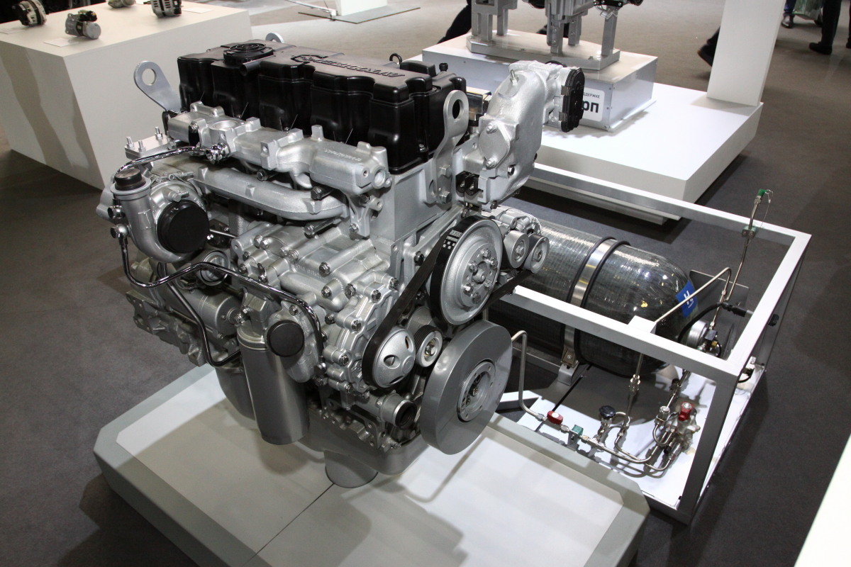 Помимо транспорта, на стенде ГК «СТТ» представлены новые силовые агрегаты для коммерческого транспорта – дизель G51C (на фото слева) и водородный двигатель ЯМЗ-535 H2 (справа).