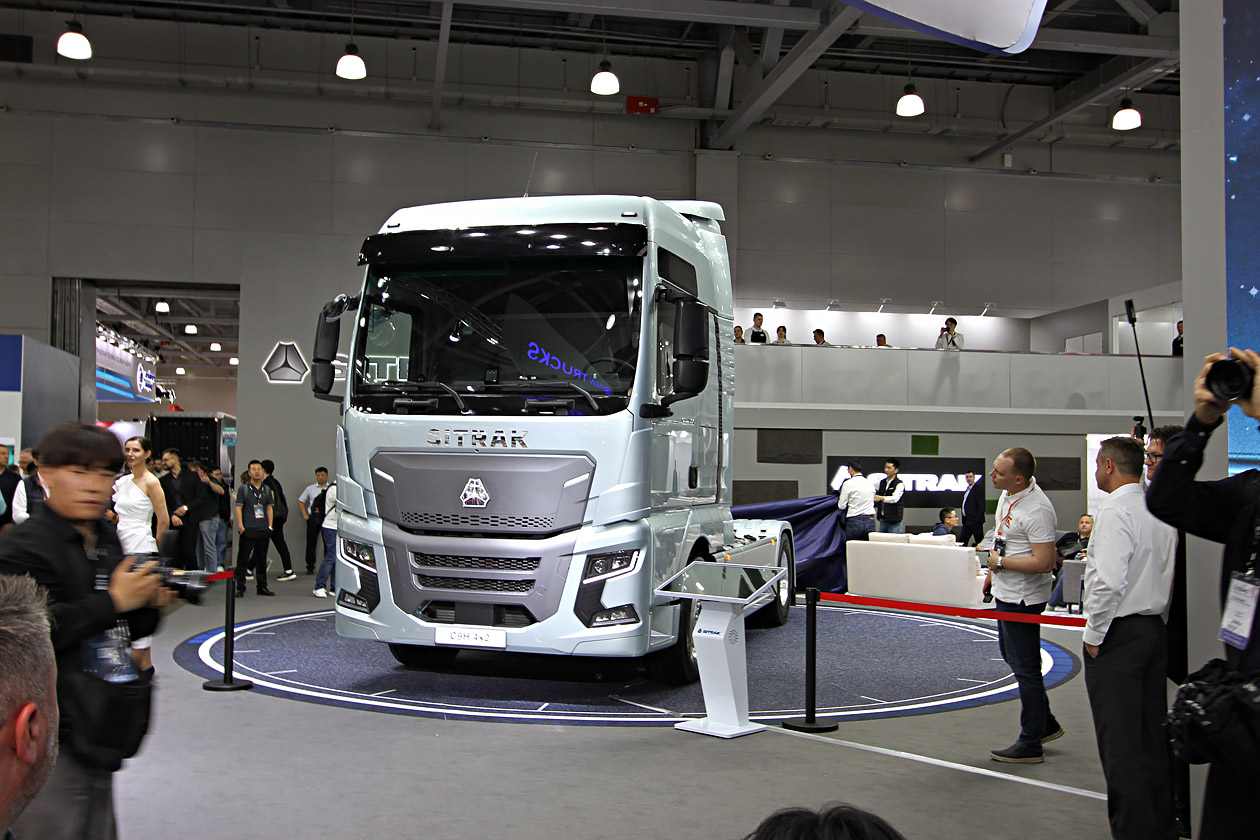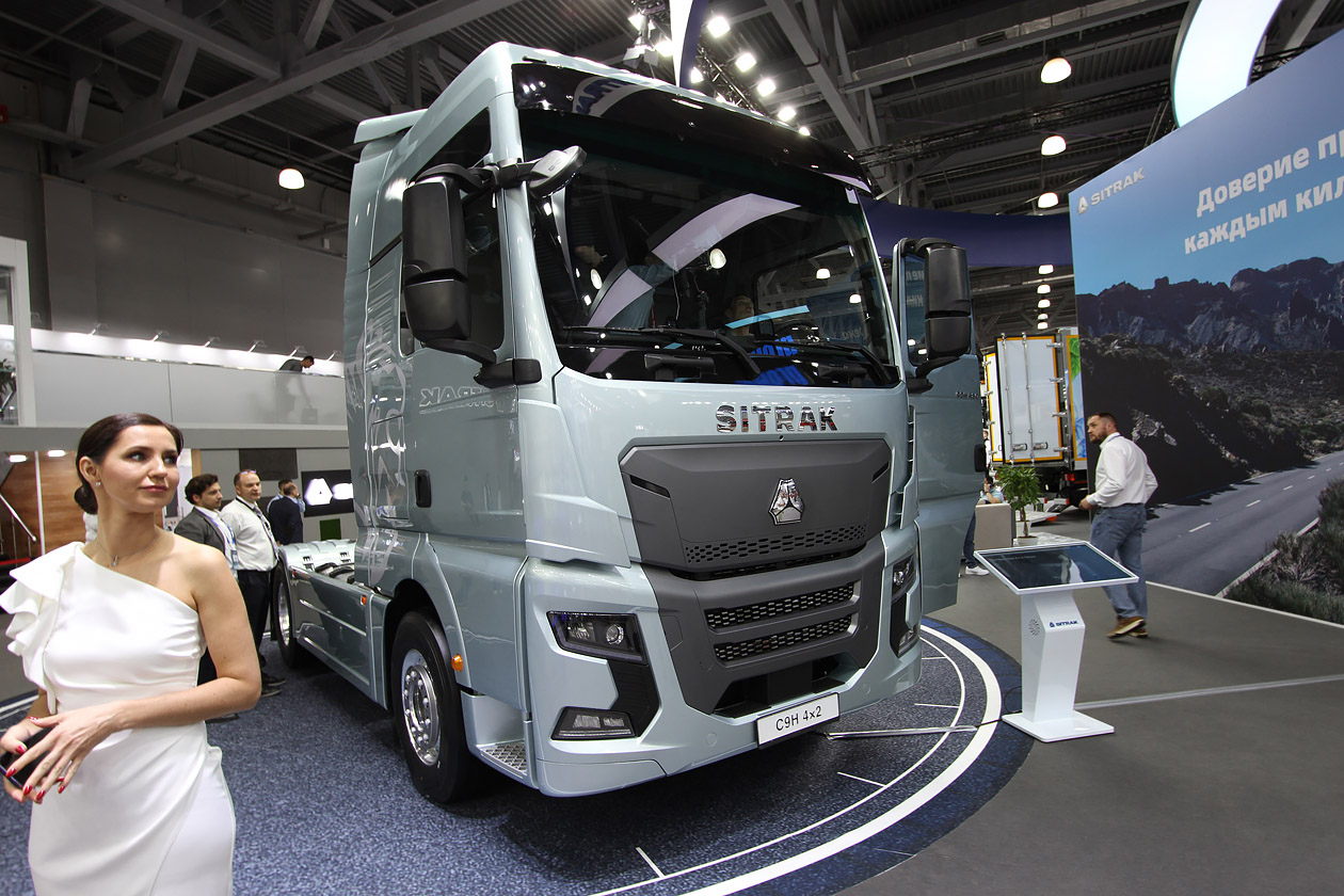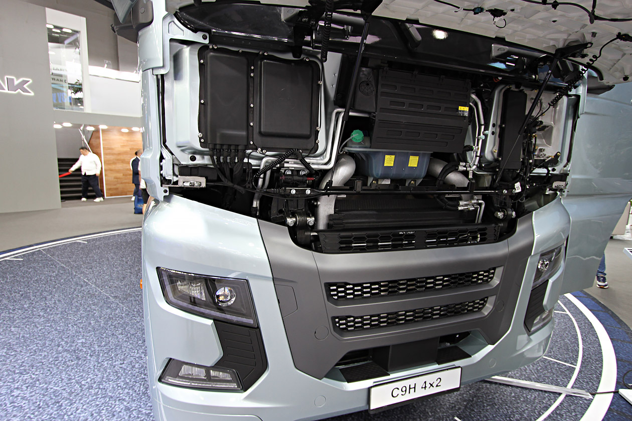 На стенде компании «Синотрак Рус» состоялась презентация новой модели седельного тягача Sitrak C9H. Основные изменения коснулись двигателя, шасси и экстерьера. Так, автомобиль будет поставляться с двигателем MC13.48-50А и 12-ступенчатой автоматизированной коробкой передач ZF. Благодаря измененной конфигурации шасси был увеличен объем топливных баков, которые теперь суммарно вмещают 1300 литров топлива (650 + 650 литров). Вместимость бака AdBlue стала в два раза больше и составляет 90 литров. А благодаря измененному положению заливной горловины процедура заправки этой технической жидкости стала проще. Форма бампера, передней панели кабины, дефлекторов, обвеса шасси, а также фар снижает сопротивление воздуха и уменьшает загрязнение автомобиля в процессе эксплуатации.