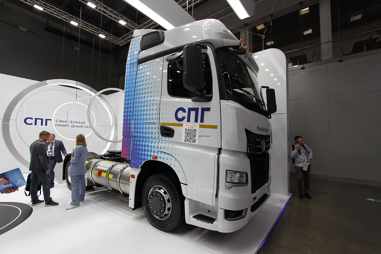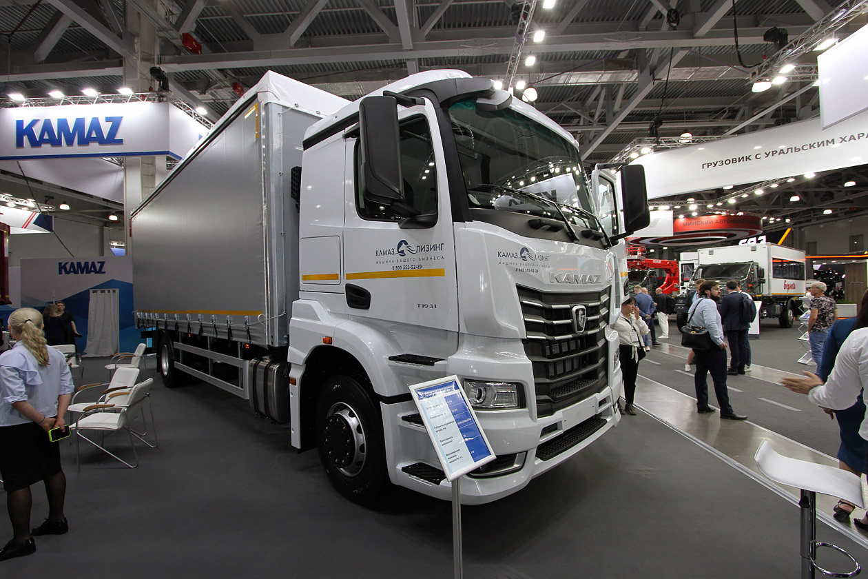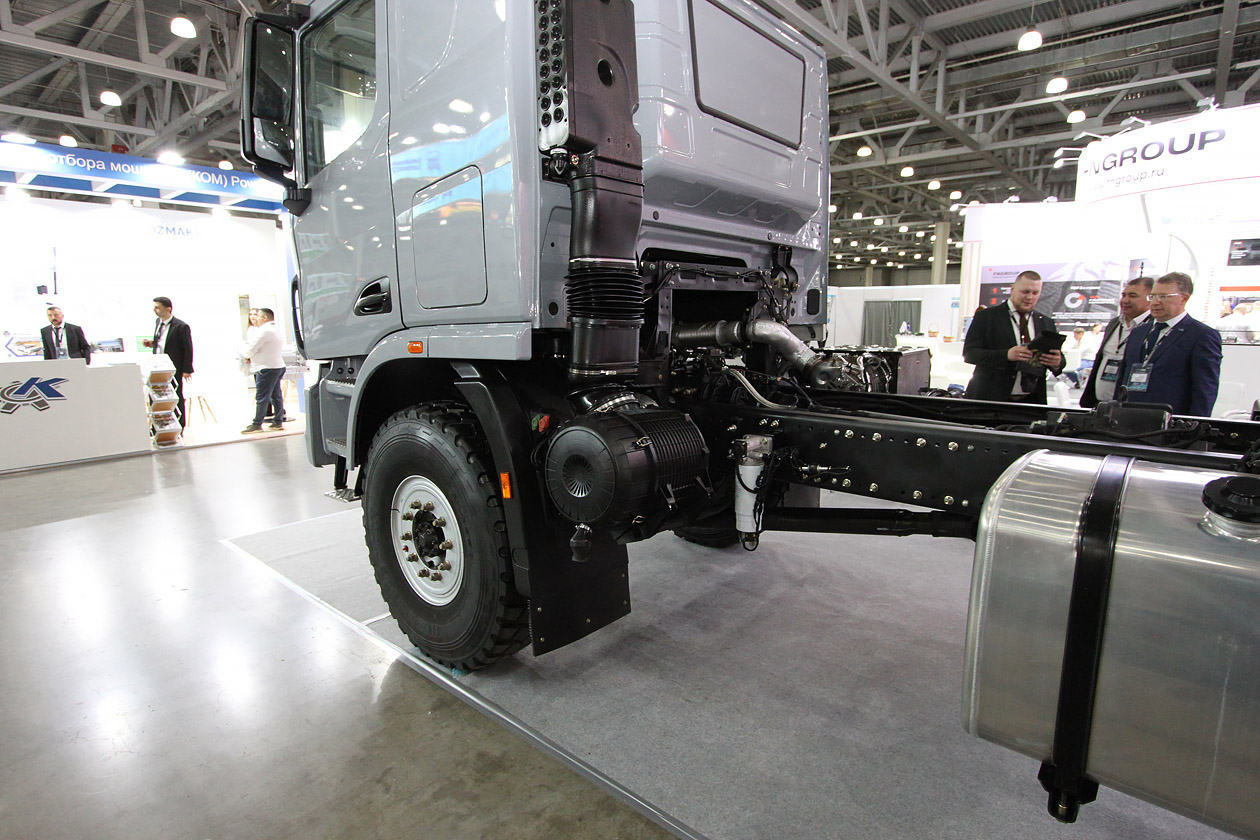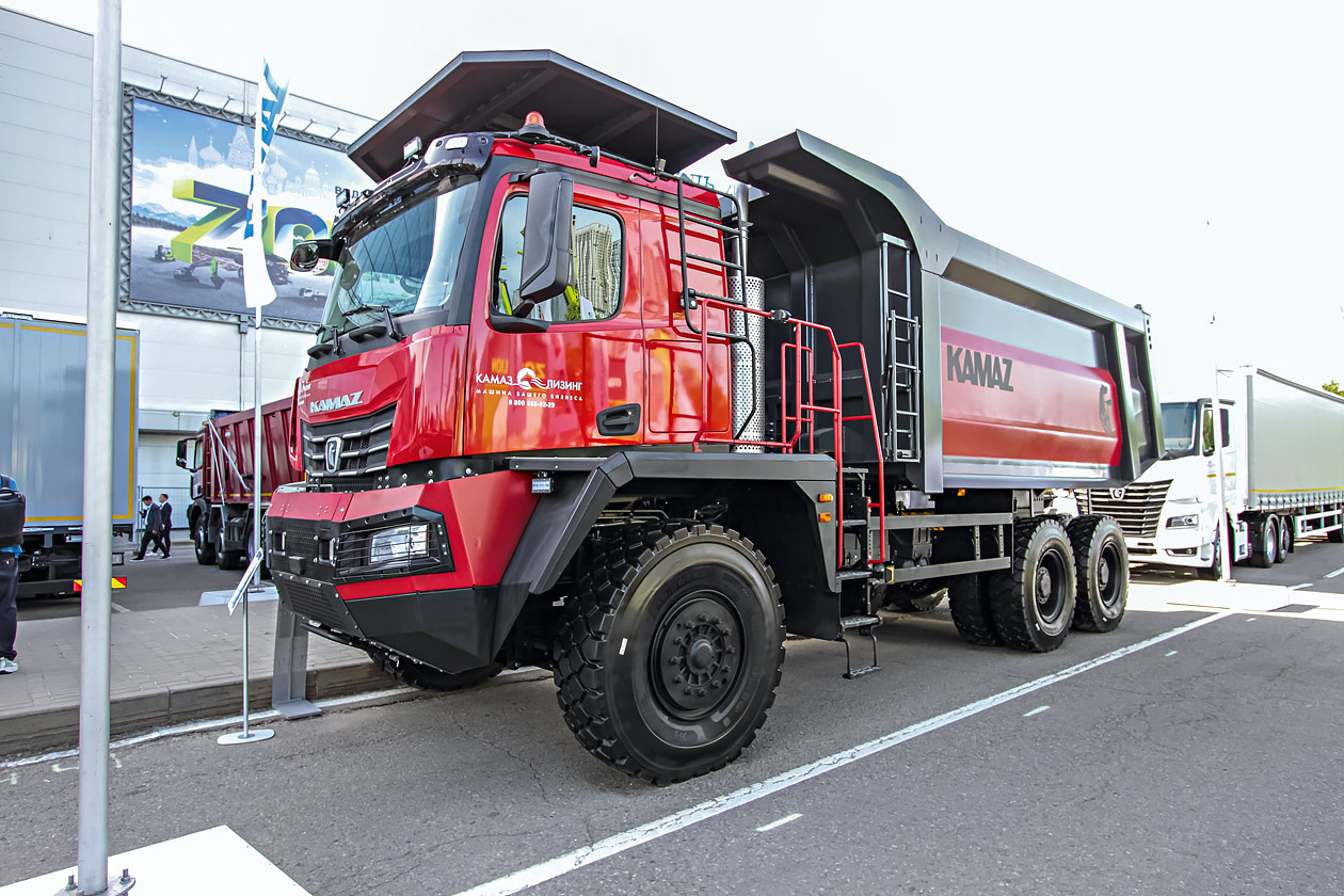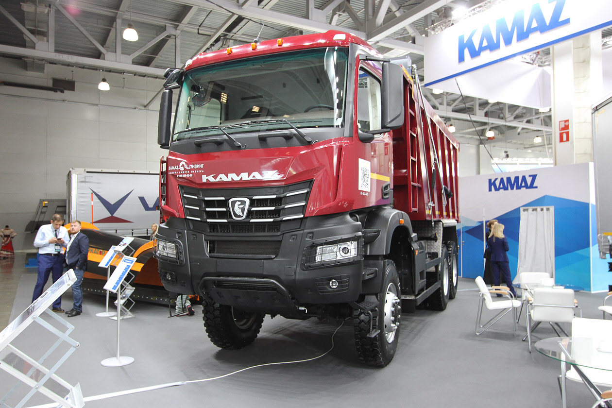 На стенде Камского автогиганта уже который год акцент делается исключительно на модельный ряд К5. В основном демонстрируются седельные тягачи и самосвалы. На этот раз рядом с седельным тягачом КАМАЗ‑54901 на СПГ в сцепке со шторным полуприцепом ТЗА (16,5 метра) стоял полноприводный самосвал КАМАЗ‑65952 (6х6). Кроме того, дальнейшее развитие получила тема использования самосвала КАМАЗ‑6595 (6х4) под КДМ. К разработке «Меркатор» присоединили КДМ от смоленского завода коммунальных машин — ЭД‑445В1.