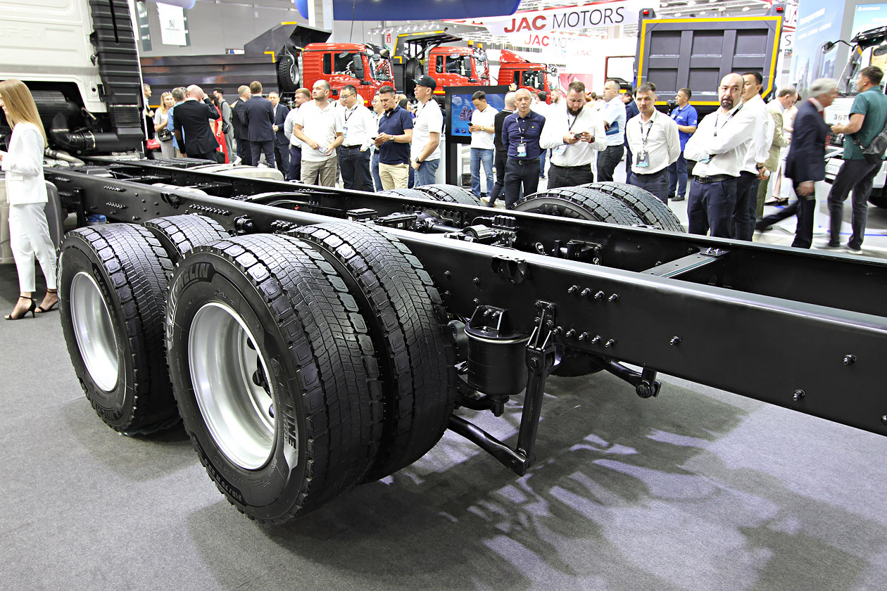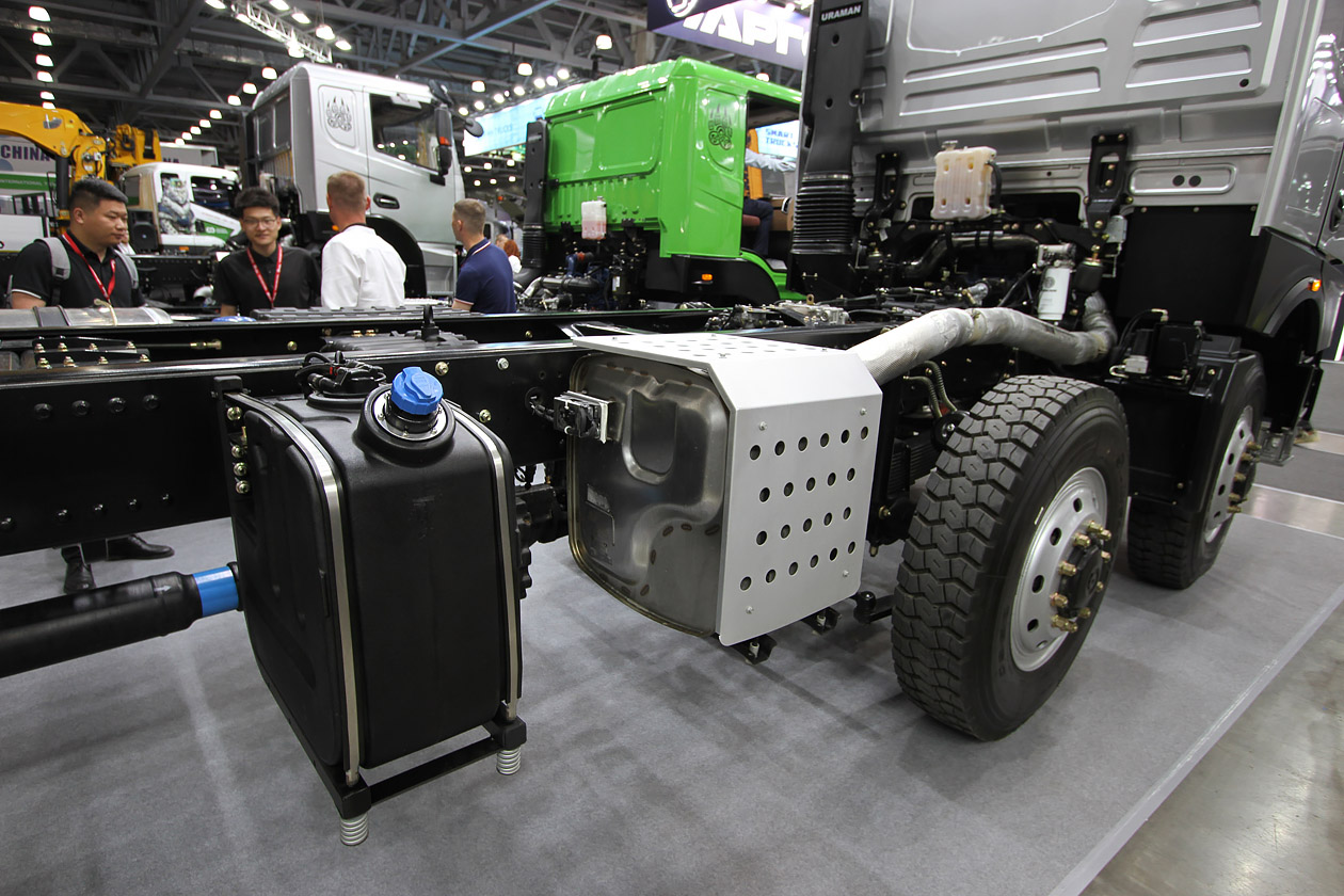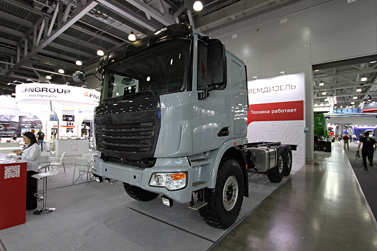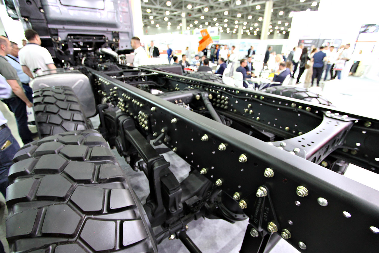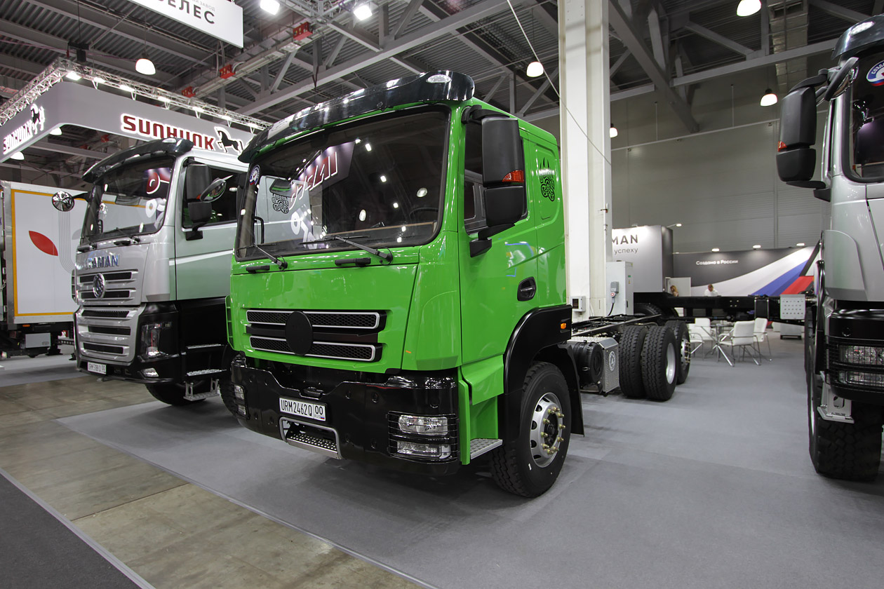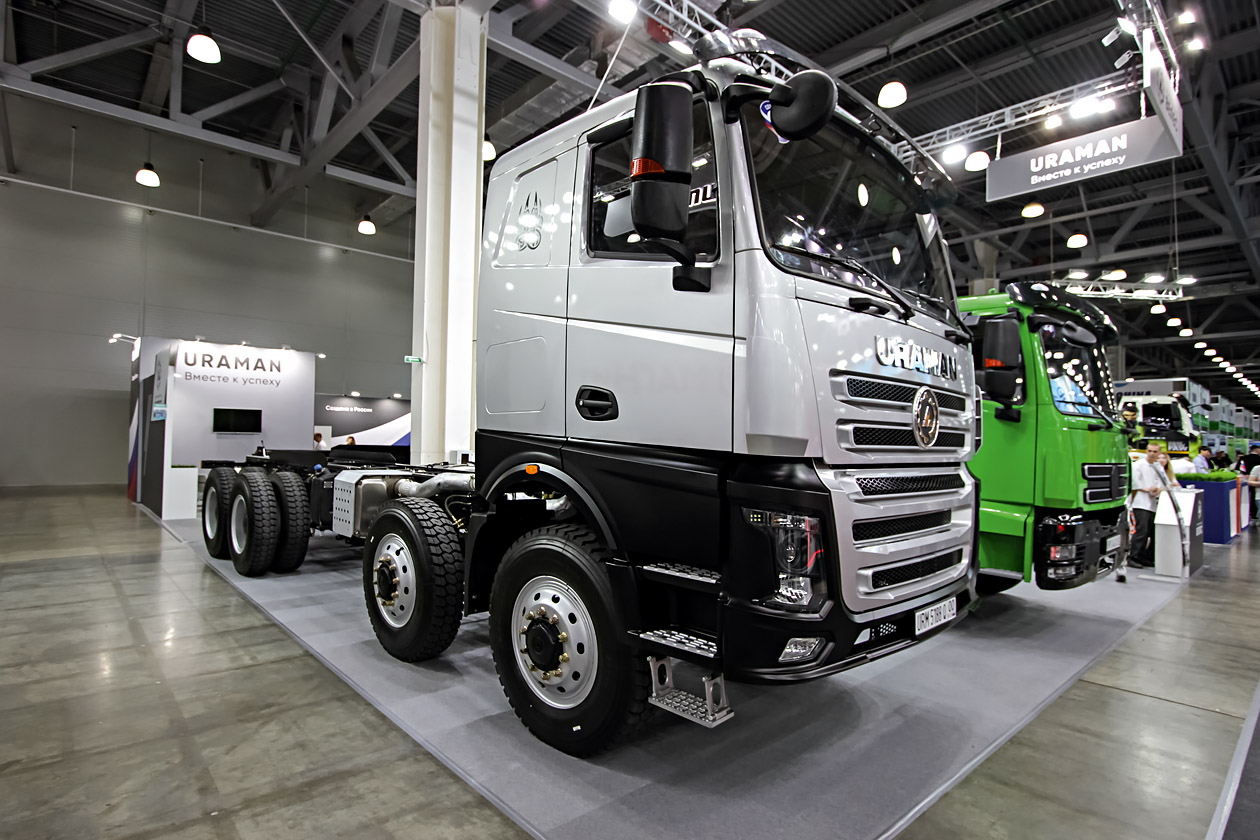 Сначала — о тех, кто заявил о себе впервые. Заводы «Велес» с грузовиками под брендом URAMAN. Почему заводы? Две локации: Ульяновск и Миасс, вторая — поближе к основным клиентам. В качестве стратегии выбрана индивидуальная работа с потребителями. Заявленные шасси относятся к машинам полной массой от 16 тонн и выше. Привод — на задние мосты или полный. Колесные формулы — от 6х2 до 8х8. Компонентная база — в основном китайская. Кабина — от одного из производителей из Поднебесной. Машины могли бы оснащать и отечественными агрегатами, но пока остро стоит проблема с их качеством.