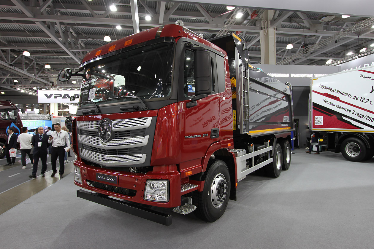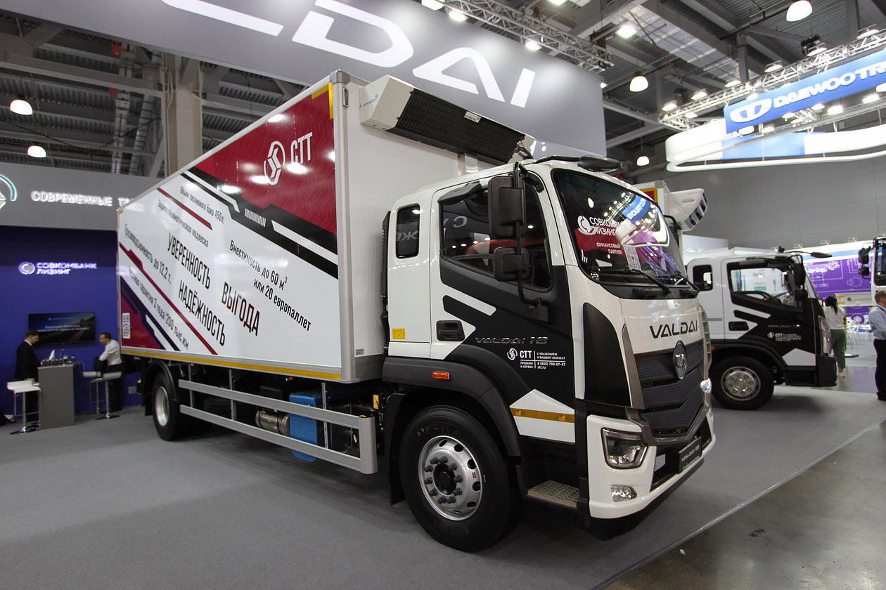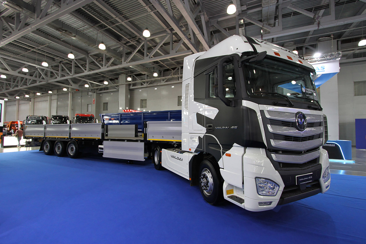 Компания «Современные транспортные технологии» (СТТ) выставила весь модельный ряд грузовиков под брендом «Валдай». От седельного тягача («Валдай 45») и тяжелого самосвала («Валдай 33») до среднетоннажников и чуть выше («Валдай 12» и «Валдай 18»).
