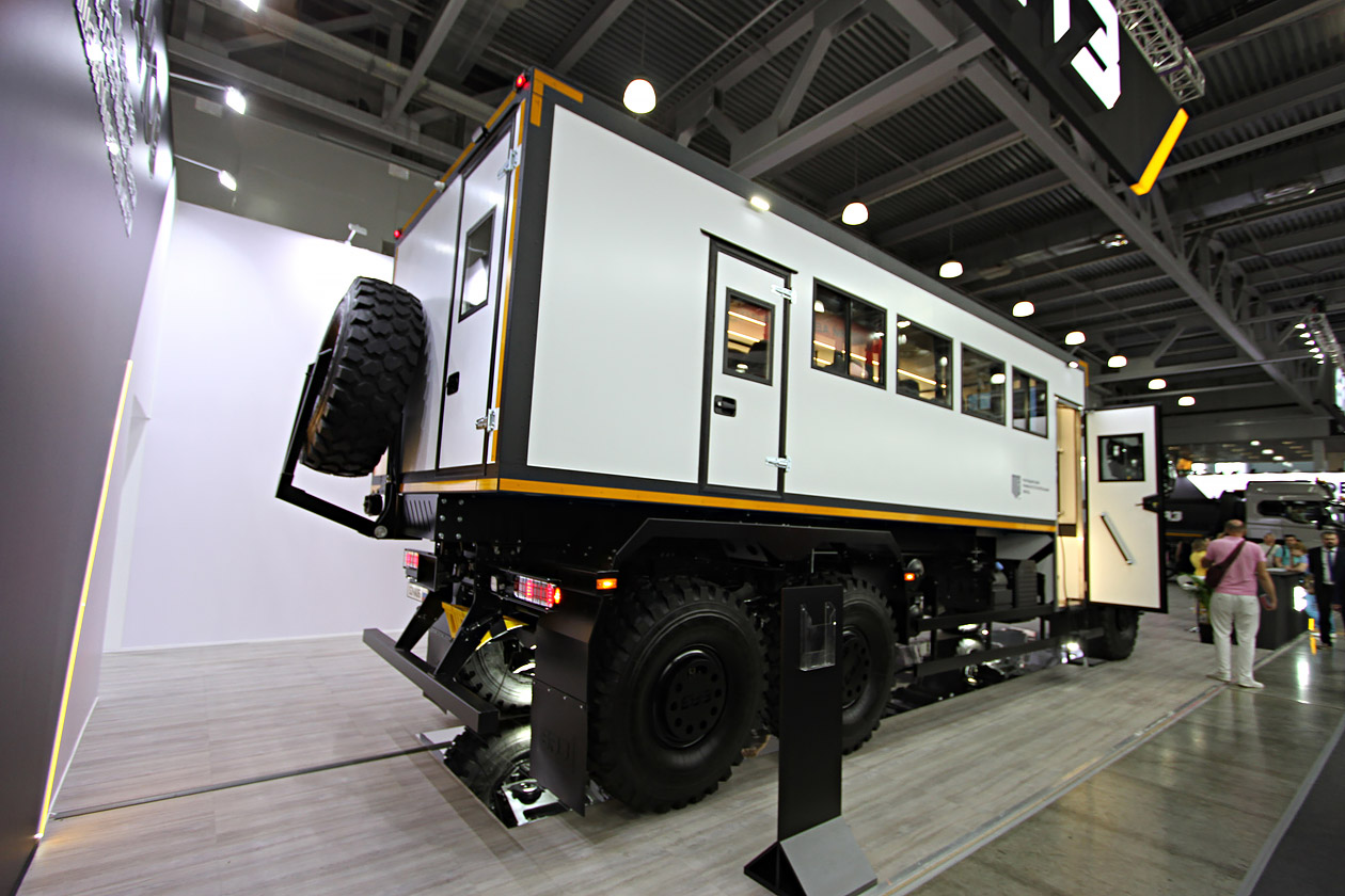 Завод «Романов» (БАЗ) расширил предложение. Помимо шасси, седельного тягача и самосвала был показан полноприводный вахтовый автобус БАЗ S34A06, рассчитанный на перевозку 24 пассажиров, с грузовым отсеком объемом более 5 куб. м. Автомобили БАЗ обладают повышенной проходимостью благодаря применению независимой подвески.