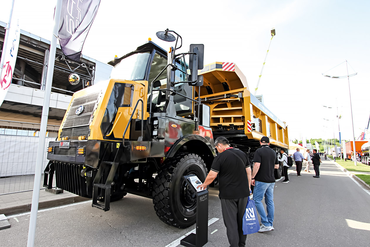 Наконец, «Группа БАТ» представила весьма необычный карьерный самосвал — симбиоз седельного тягача с сочлененным самосвалом. Junton 8x6 полной массой 52 тонны способен перевозить до 90 тонн скальных пород. В оснащении машины — 770-сильный дизель Weichai. Минимальный радиус разворота составляет 9,5 метра. Нечто подобное в 60-х годах прошлого века (правда, для военных нужд) разрабатывали и наши заводы (ЗиЛ‑137, КрАЗ‑255Д).