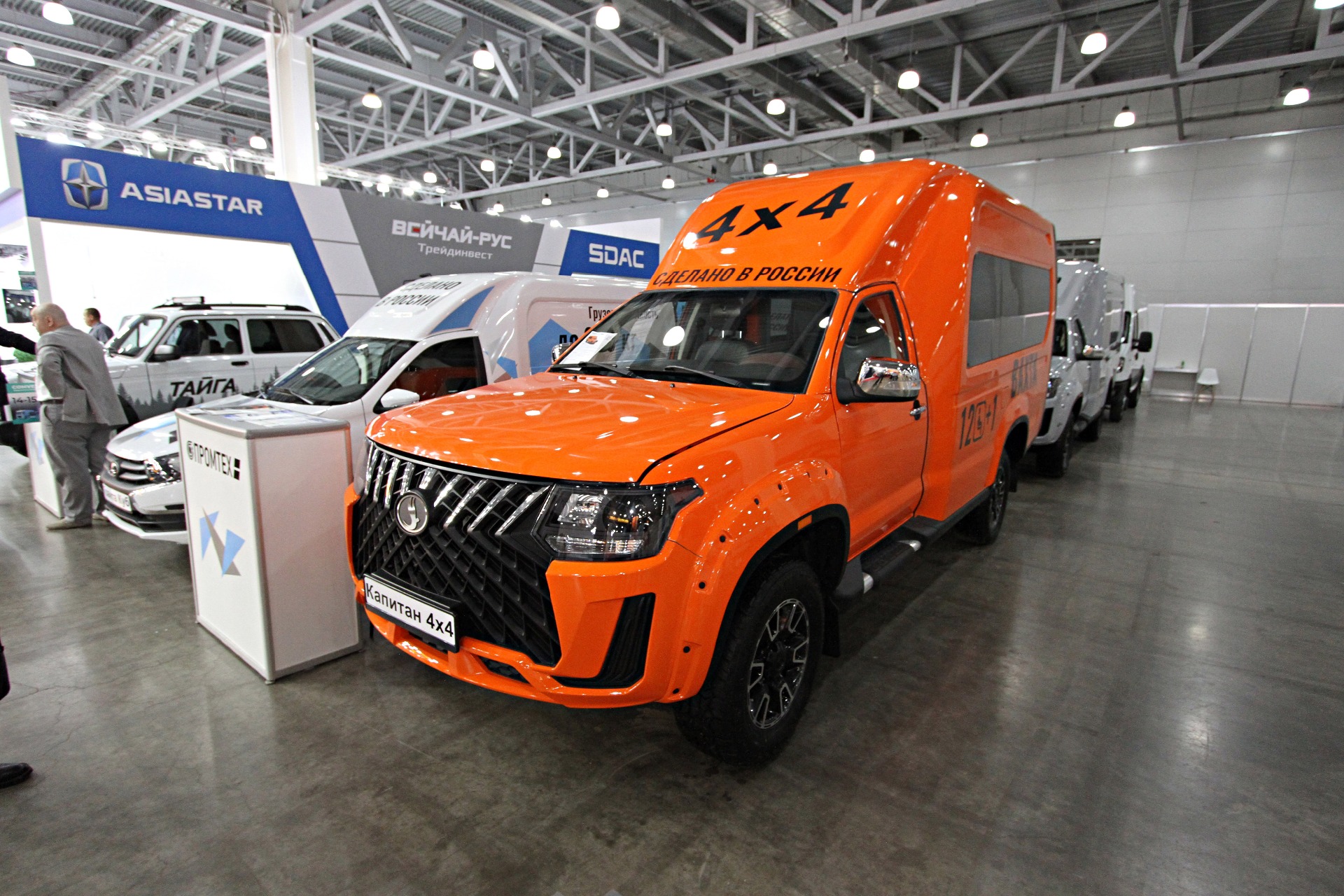 Ну и напоследок — «наши» малыши от «Промтеха». Основной интерес представляли полноприводные автомобили «Капитан 4х4» семейства KUB в двух исполнениях. Первое — 5-местный грузопассажирский вариант с отдельным грузовым отсеком вместимостью 5,6 куб. м и грузоподъемностью 990 кг. Второе исполнение — 12-местный микроавтобус, по сути, компактная «вахтовка» с комфортом легкового внедорожника.
