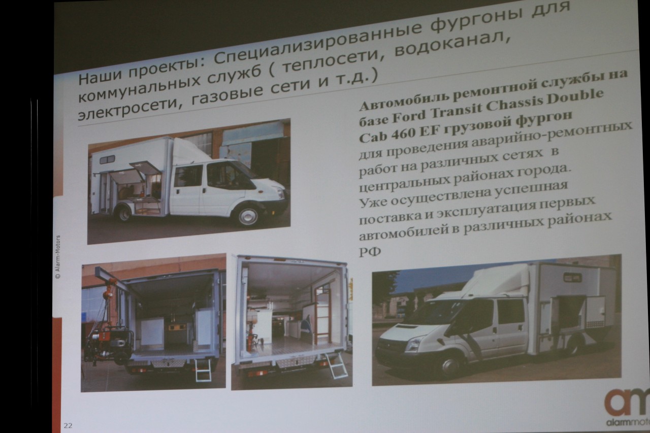 На мероприятии были представлены автомобили специальных версий Ford Transit: маршрутные такси, школьные автобусы, бортовой и изотермический фургон, автомобиль для людей с ограниченными физическими возможностями, автомобиль скорой помощи, грузопассажирская версия и многие другие модификации нового Ford Transit.