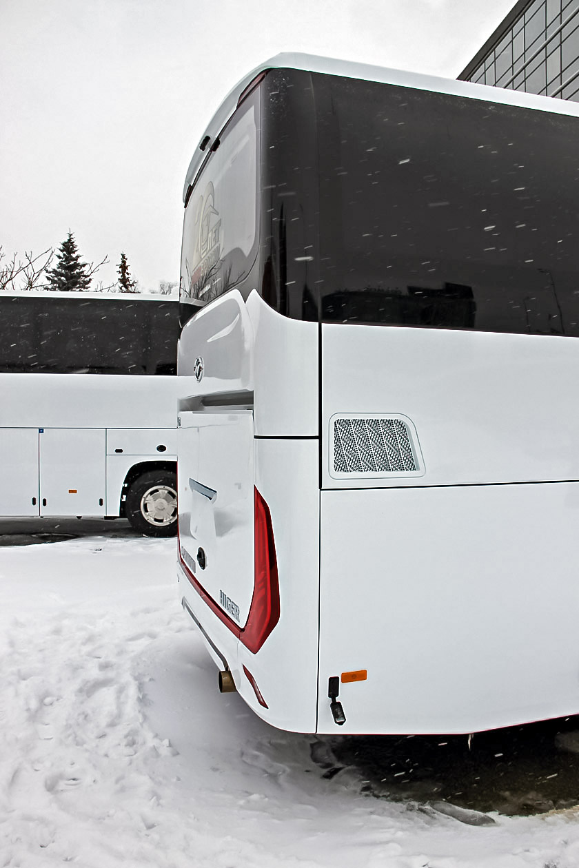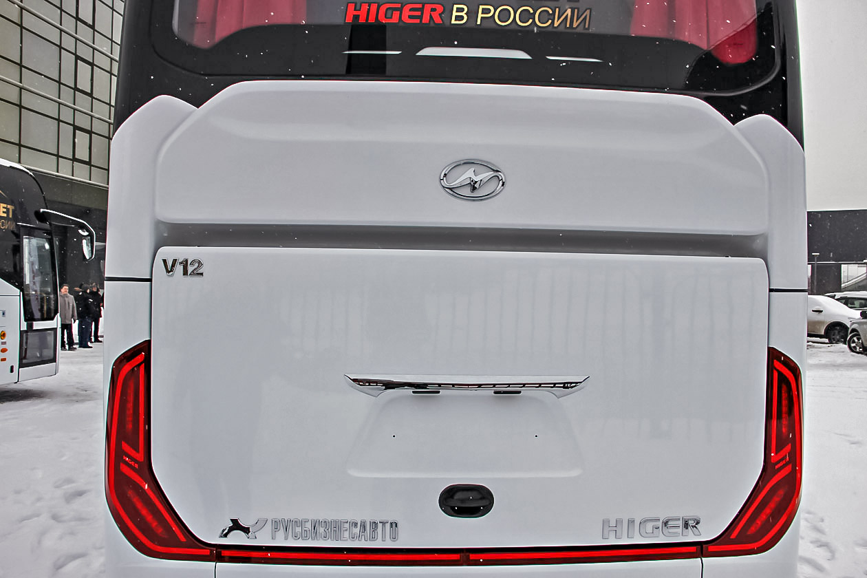 В качестве образцов на смотровой площадке были представлены два автобуса: V12 и V12PRO. Машины отличаются по высоте и назначению. Модель V12 высотой 3,63 метра изначально предполагалось использовать для межгорода, причем без спального места для сменного водителя. Однако, идя навстречу пожеланиям перевозчиков, ее снабдили подобной опцией. Это как раз подтверждает тот факт, что машины для России имеют специфические отличия. Автобус рассчитан на перевозку от 47 до 55 пассажиров в зависимости от комплектации. Сиденья расположены на подиумах. Объем багажного отделения — 9,9 куб. м.