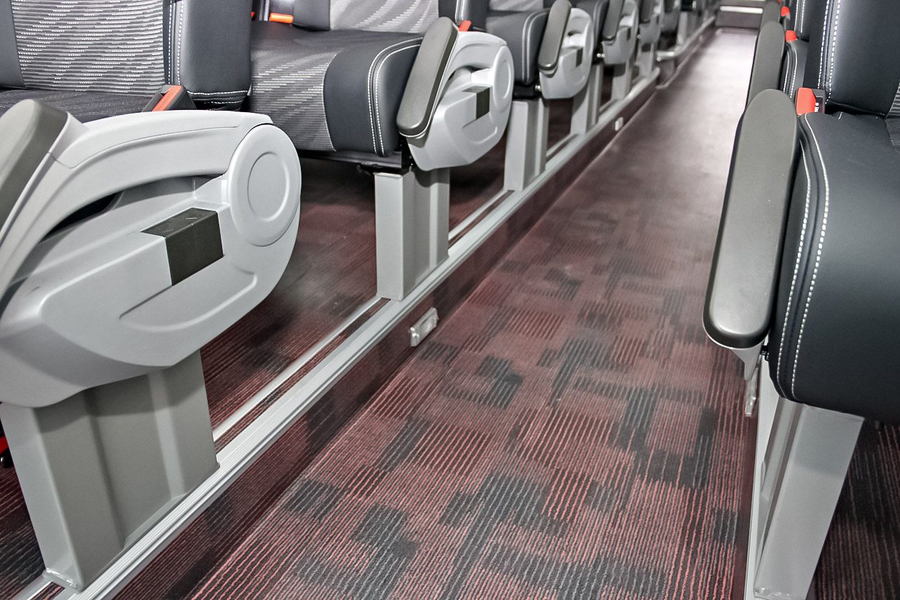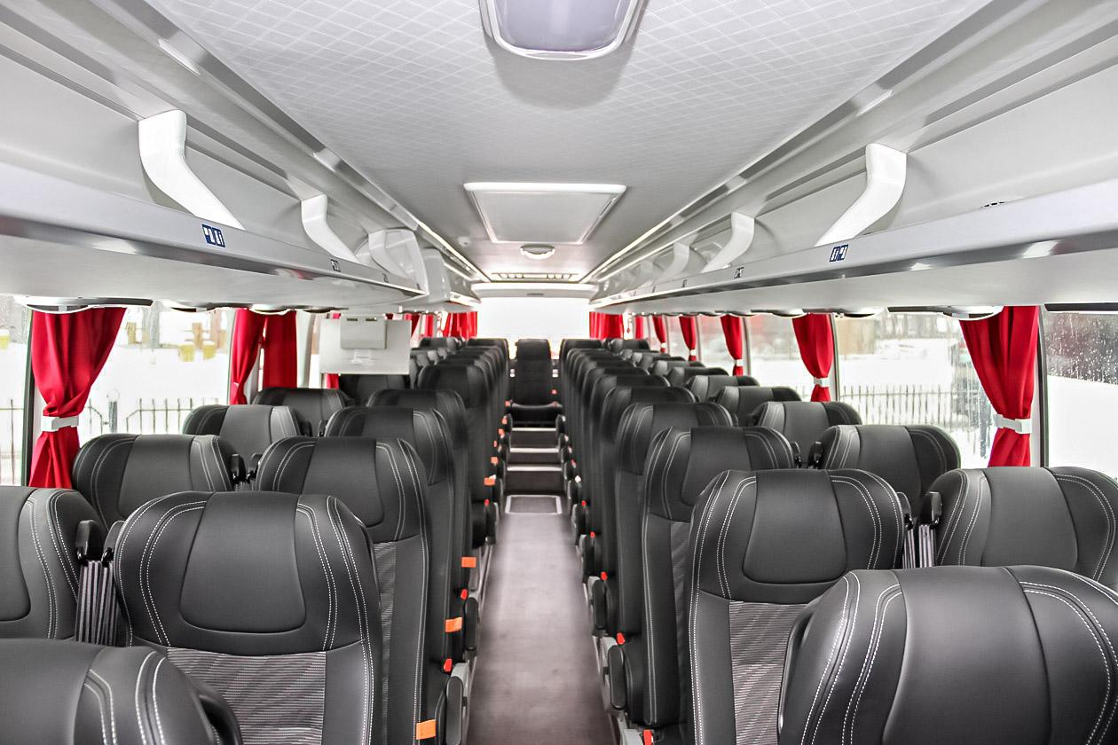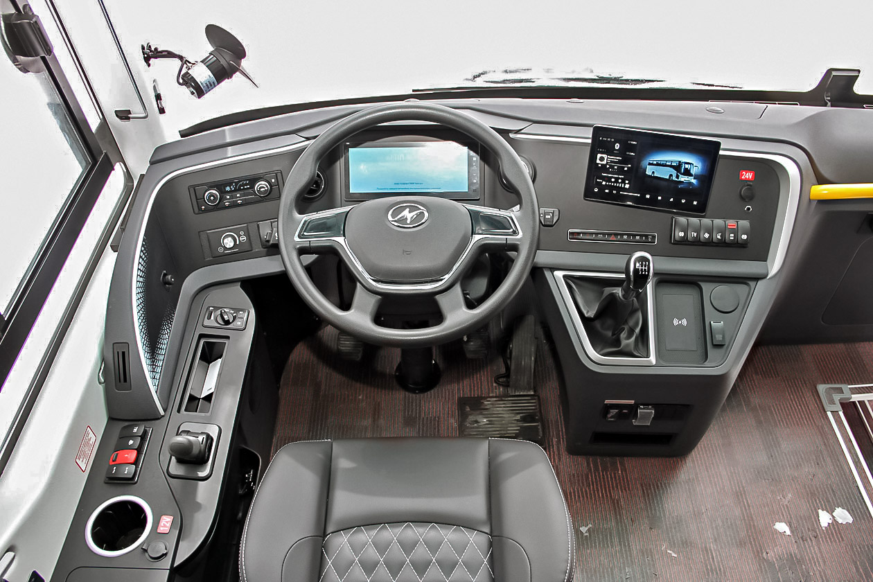 Анатомические пассажирские кресла с высокой спинкой выполнены из комбинированных материалов с применением износостойкой ткани и легко очищаемой экокожи. В исполнении V12PRO сиденья дополнительно снабжены регулируемыми подголовниками. Многофункциональное и эргономичное рабочее место водителя повышает комфорт и снижает утомляемость при вождении.