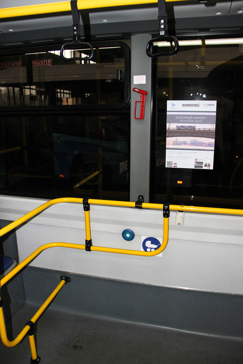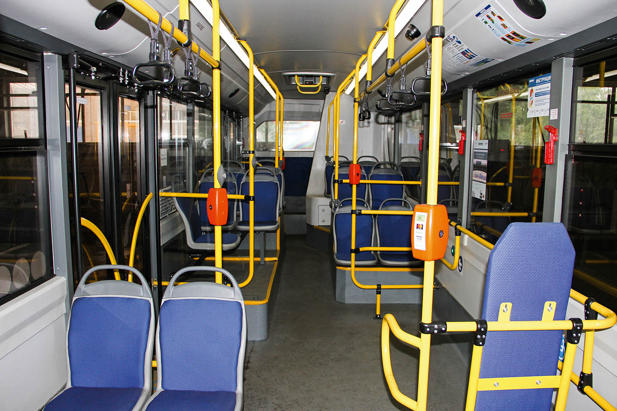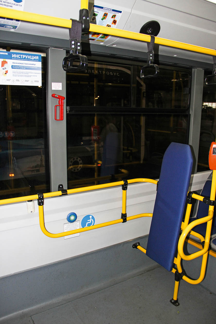 В интерьере электробуса также можно обнаружить нововведения. Салон рассчитан на 30 сидячих мест, полная пассажировместимость — 90 человек. Машина оснащена тремя широкими дверными проемами, просторными накопительными площадками, на которых есть место для пассажиров и с детскими колясками, и с ограниченной подвижностью. Естественно, в наличии и выдвижной пандус, и кнопка вызова водителя для оказания помощи.