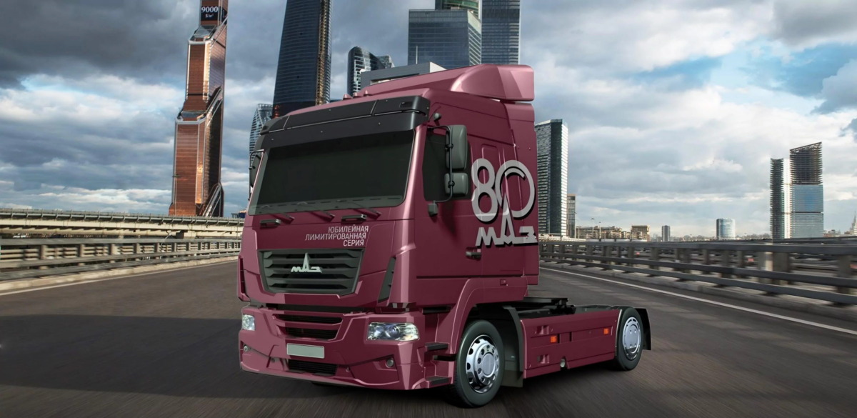 Тягач МАЗ-54402L юбилейной серии отличается от стандартной машины новым цветовым решением и рестайлинговой кабиной с расширенным функционалом.