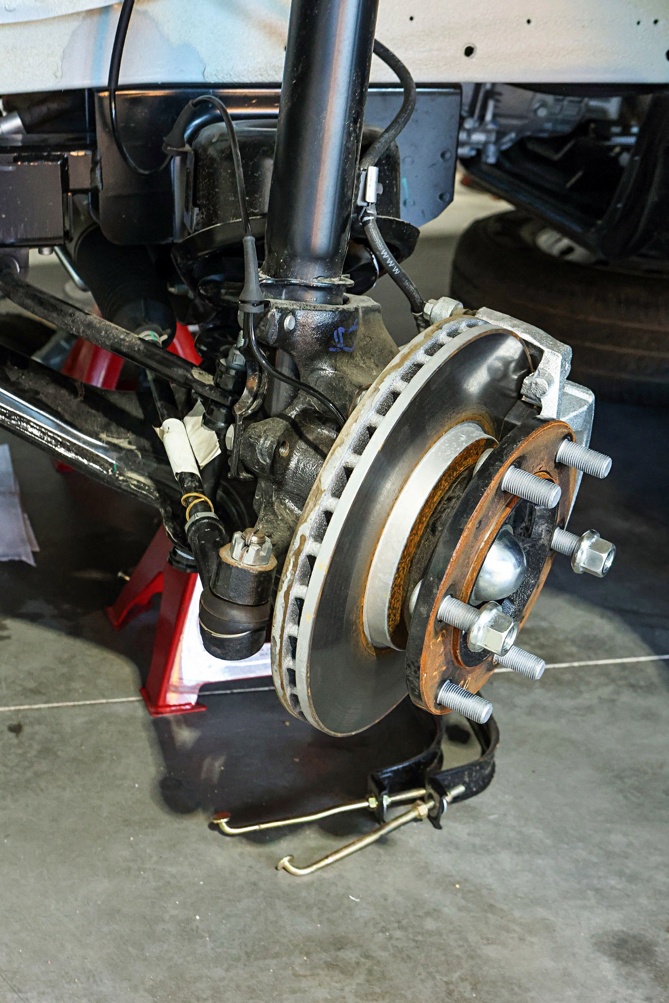 Датчик ABS имеет маркировку JAC. Тормозной диск прикручивается к ступице, но сама ступица расположена спереди — соответственно, для замены тормозного диска необходимо сначала демонтировать ступицу и только потом заниматься тормозами. Также отсутствует защитный кожух тормозного диска — вся грязь и соль будут лететь прямо на тормозные механизмы.