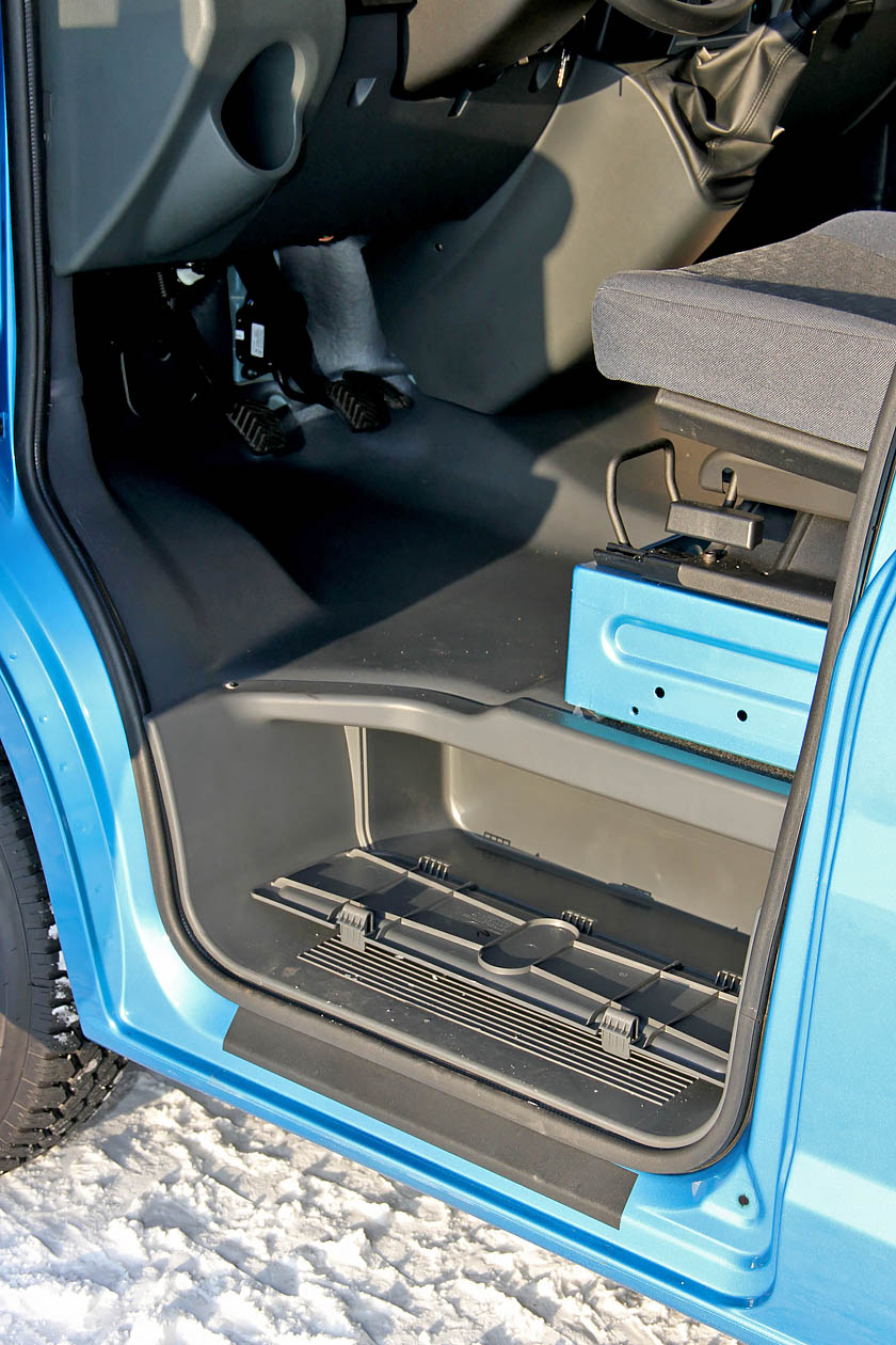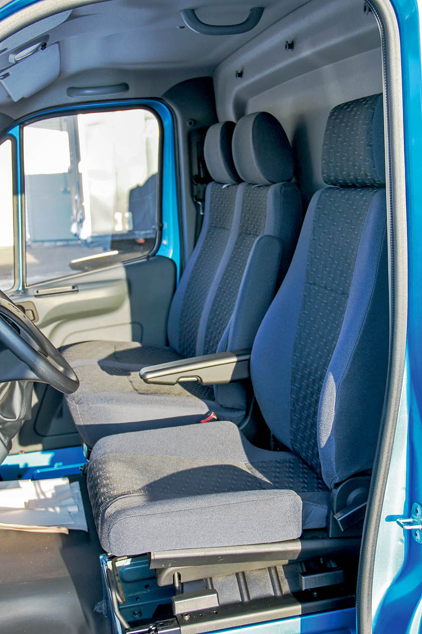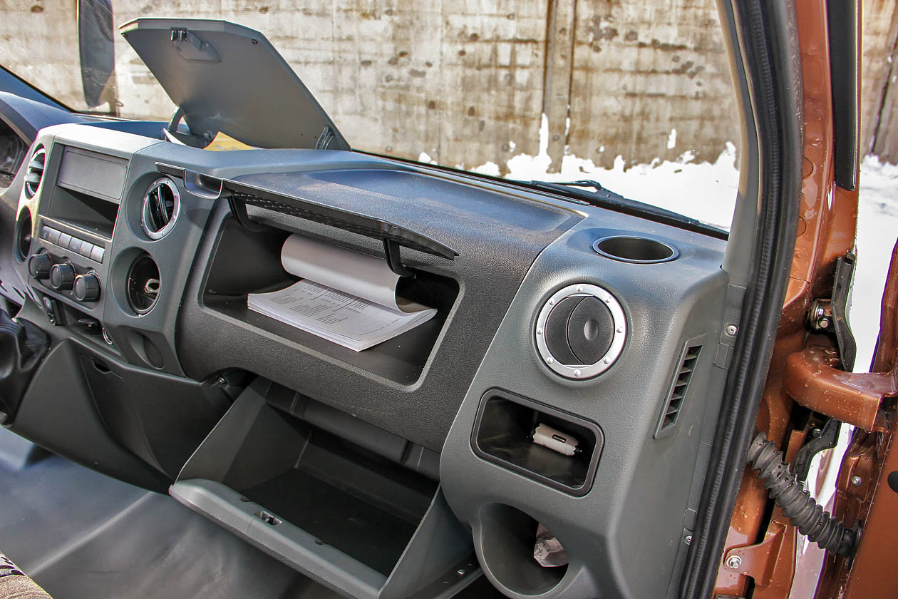 Кабина, место водителя, пассажирское сиденье — все в точности скопировано у «младшего брата». Другого и ожидать не стоило: унификация. Из утилитарных вещей напомним о наличии множества бардачков, ложементов и карманов, а также о ящичке под сиденьем водителя и двух боксах в подножках каждой из сторон. Не забудем и о ручке на потолке для среднего пассажира — очень удобная вещь.