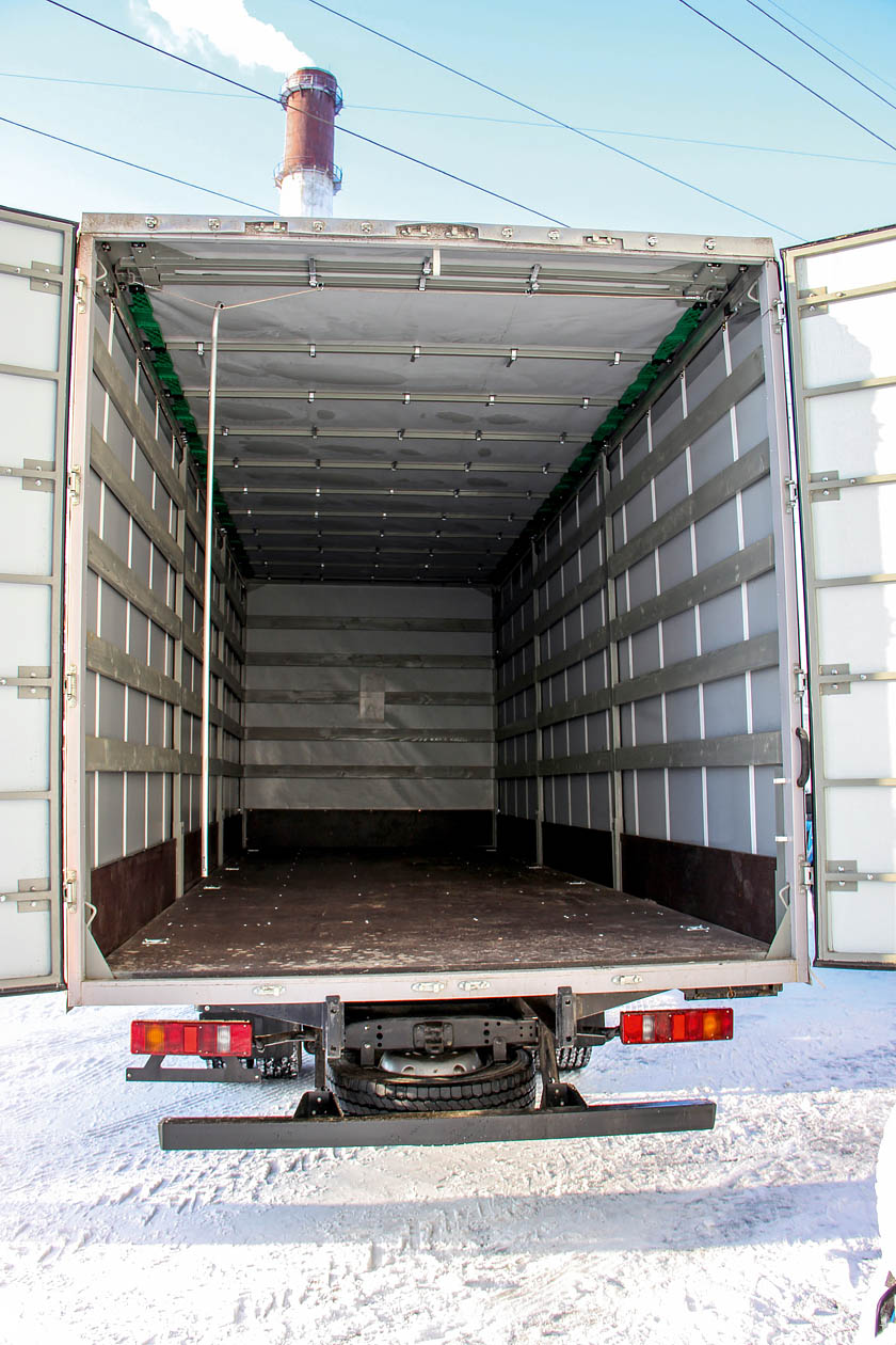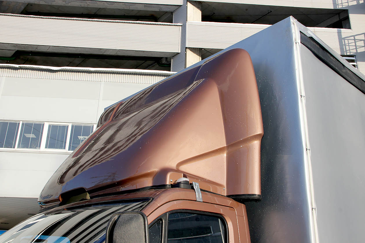 Опять же в моем случае «ГАЗон Next» 10.0 был укомплектован тентовым фургоном с распашными металлическими дверьми сзади. В качестве «аксессуара» внутри фургона на тросе висела «кочерга», предназначенная для того, чтобы управляться с тентом. Поскольку фургон достаточно высокий, его оснастили аэродинамическим обтекателем, установленным над кабиной.