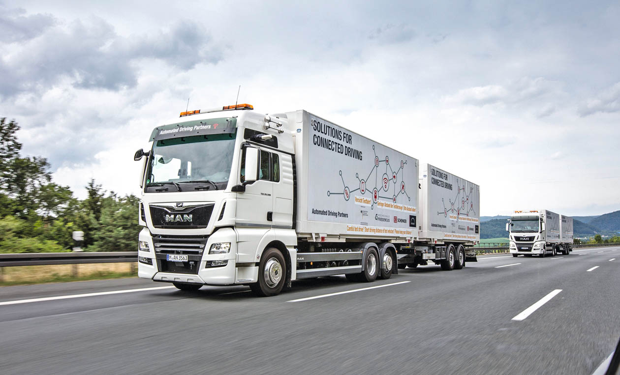 Технология платунинга (более удобоваримый термин — «конвой»), разработанная MAN, уже проходит эксплуатационные испытания. Речь идет о так называемой «электронной сцепке», посредством которой два или более грузовых автомобилей соединены между собой. Первый грузовик задает скорость и направление, остальные автомобили в колонне без участия водителей следуют друг за другом на минимальной дистанции около 10–15 метров. Правда, человек все равно находятся в кабине на всякий случай. Движение в аэродинамической «тени» позволяет экономить до 10% топлива, ощутимо способствует снижению выбросов CO2 и обеспечивает более высокую безопасность на магистралях. Аналогичные разработки имеются и у остальных членов «большой семерки», поскольку они проводились под эгидой European Truck Platooning Challenge.
