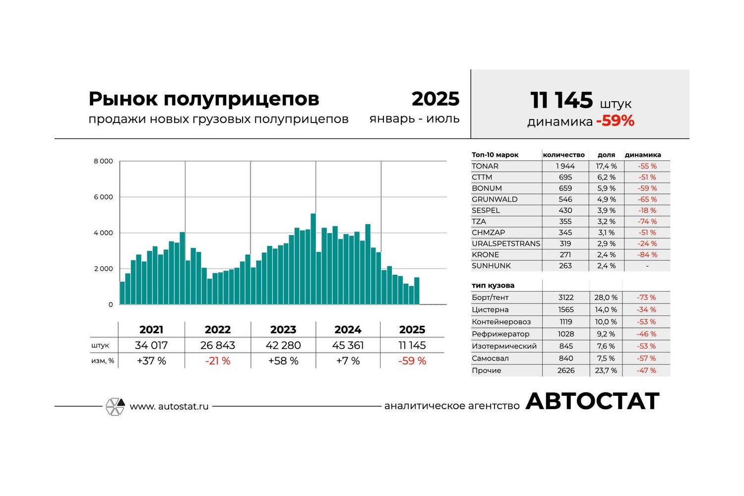 Аналитическое агентство «Автостат» опубликовало данные о структуре рынка полуприцепов в России в январе — июле 2025 года.