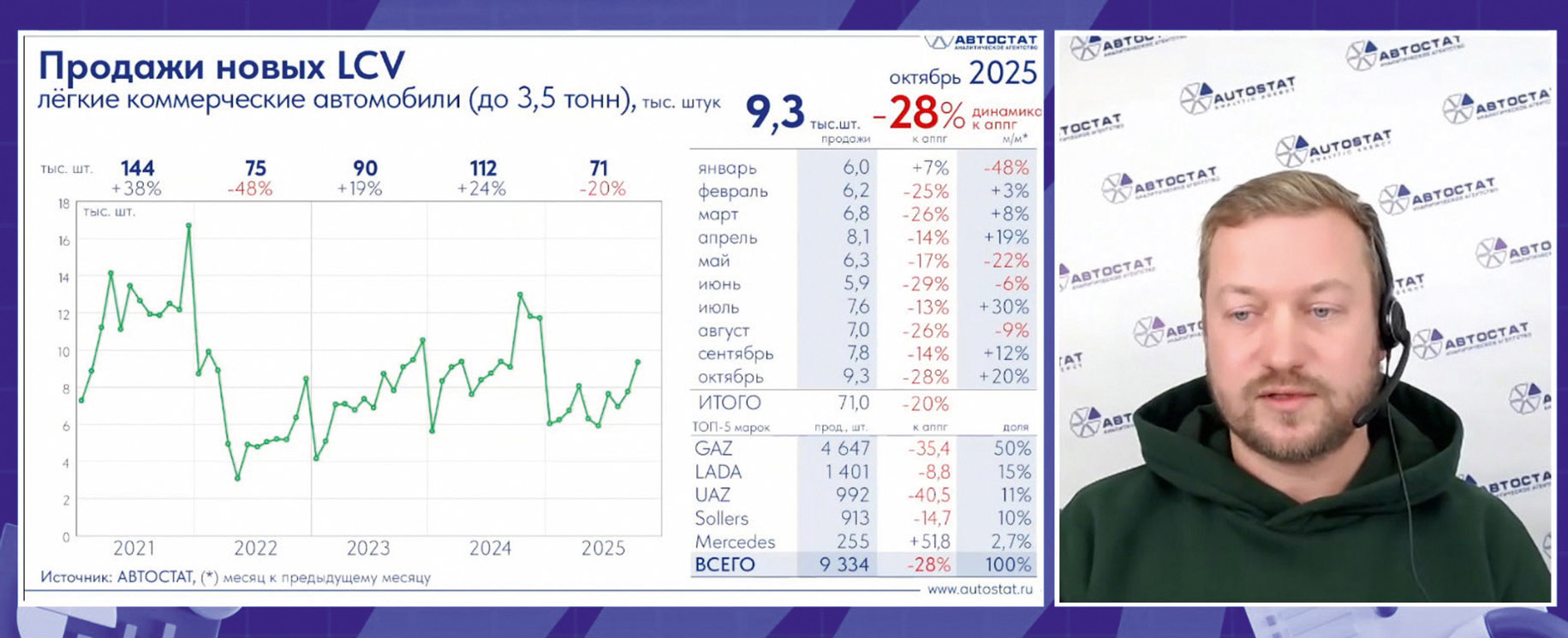 Рынок новых легких коммерческих машин (LCV) в октябре упал на 28% по отношению к тому же месяцу прошлого года, при этом оказался на 20% больше, чем в сентябре 2025 года. Так, в октябре в нашей стране было реализовано 9,3 тыс. новых легких коммерческих автомобилей.