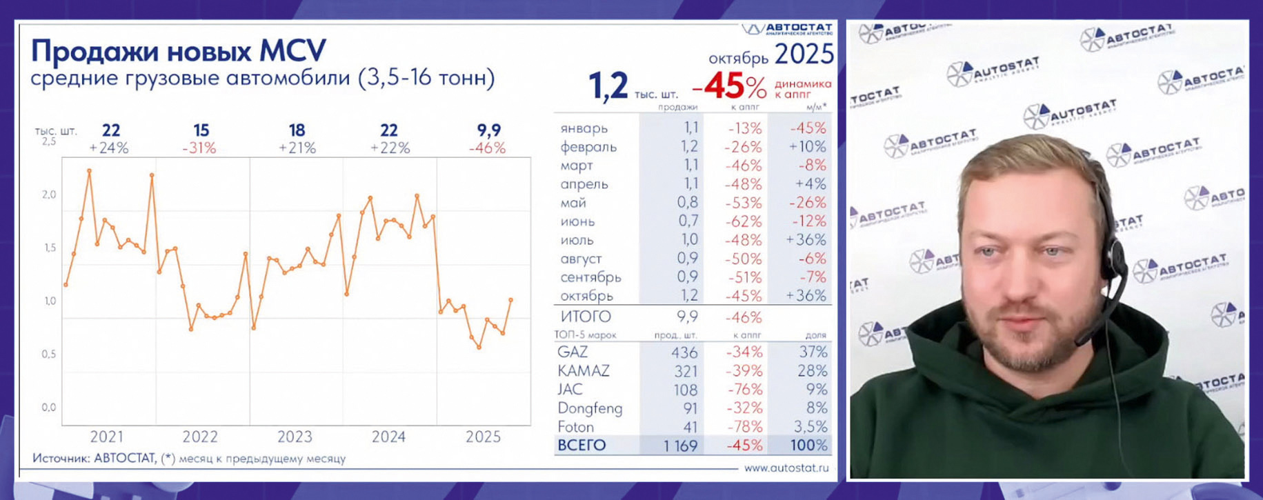В модельном рейтинге в сегменте MCV по-прежнему лидирует «ГАЗон Next»; его рыночная доля в октябре составила 25,7%. За 10 месяцев 2025 года в РФ было реализовано 9,9 тыс. таких грузовиков, что на 46% меньше, чем за аналогичный период 2024‑го.
