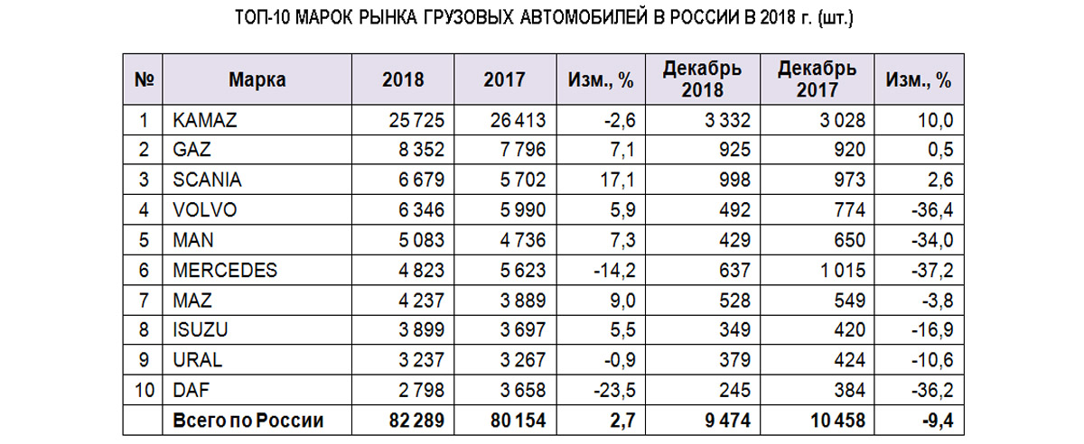 По итогам же декабря 2018 года объем рынка новых грузовых автомобилей в России составил 9,5 тыс. штук (-9,4%). При этом эксперты резюмируют – несмотря на почти полугодовое падение рынка грузовиков, год все же удалось закончить с небольшим плюсом. Сказался внушительный задел, созданный в первом полугодии.